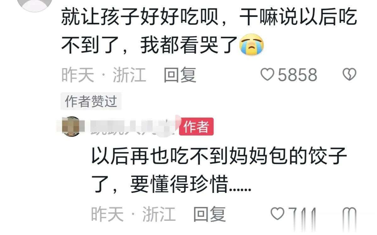 看了这个我忍不住哭了,一位男子的妻子癌症去世了,生前给爷俩包的饺子,男子一直不舍得吃,放冰箱里8个月,男人怕坏了,拿出来煮给儿子吃,这位父亲对儿子说:“快吃吧!以后再也吃不到妈妈包的饺子了,要懂得珍惜”。 儿子一直盯着饺子一句话没说,最后一个没吃转身走了,看着孩子的背影真让人难受。 网友:我娘蒸的馍我放冰箱里11年了,想她了就拿出来闻闻。 网友:已经泪两行,孩子妈妈走了快两个月了,房间摆设和她的东西我一样没动,保持原样。#母子# #亲情#