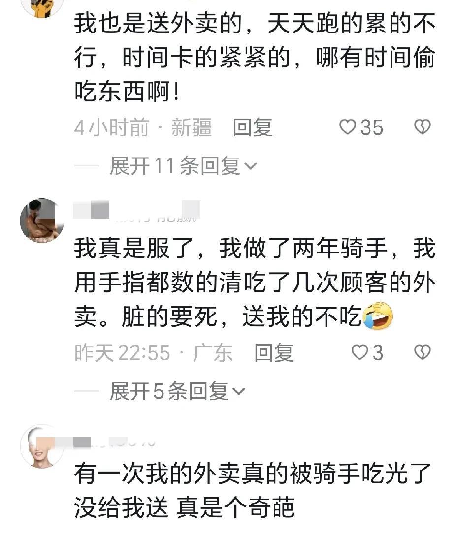 近日哈尔滨延寿县一男子点了一份外卖,他发现骑手偷吃自己的外卖,于是拍下了视频给相关平台,有关人员回应已经把骑手停职了,但是第二天该男子发现骑手仍在送外卖。 有关人员再次回应:他给我的证据不足以证明,骑手确实偷吃了东西,给他解决方案他不同意,那我也没有办法,他愿意上哪里告上哪里告,现在骑手已经停职,我们也在调查。 网友:我也是送外卖的,天天跑的累的不行,哪有时间偷吃外卖啊!