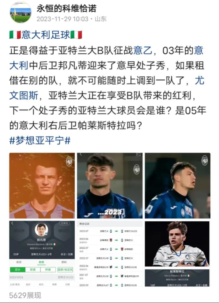 🇮🇹意大利足球🇮🇹 B队的好处在那? 虽然说都在意丙,但如果踢的好可以随时上调到一队踢意甲,如果租借到别的队踢意丙,你表现再好也调不到一队,本赛季亚特兰大的红利兑现了,03年的邦凡蒂,又推出的一个中后卫,他的防守我感觉比斯卡尔维尼要好,下赛季斯卡尔维尼估计要换成钱了 看看亚特兰大这一堆本土青训,未来都是钱啊,贝尔加莫足球环境不是吹的。