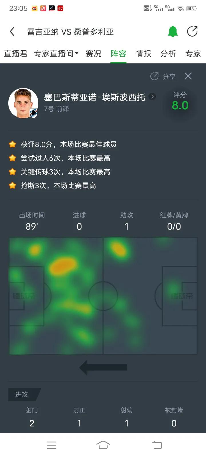 🇮🇹意大利足球🇮🇹 5胜1负 桑普多利亚强势反弹 塞巴上轮二球,本轮二助