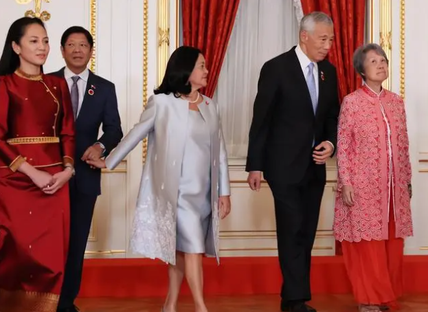 在这次晚宴上,菲律宾总理和夫人、新加坡总理和夫人、老挝总理和夫人、文莱苏丹等都出席了。她们身着各式各样的礼服,展现出各自独特的魅力。其中,柬埔寨首相夫人的一身红裙尤为引人注目。她身着红色长裙,腰间金色的点缀让整个造型更加贵气十足,宛如女明星一般璀璨夺目。