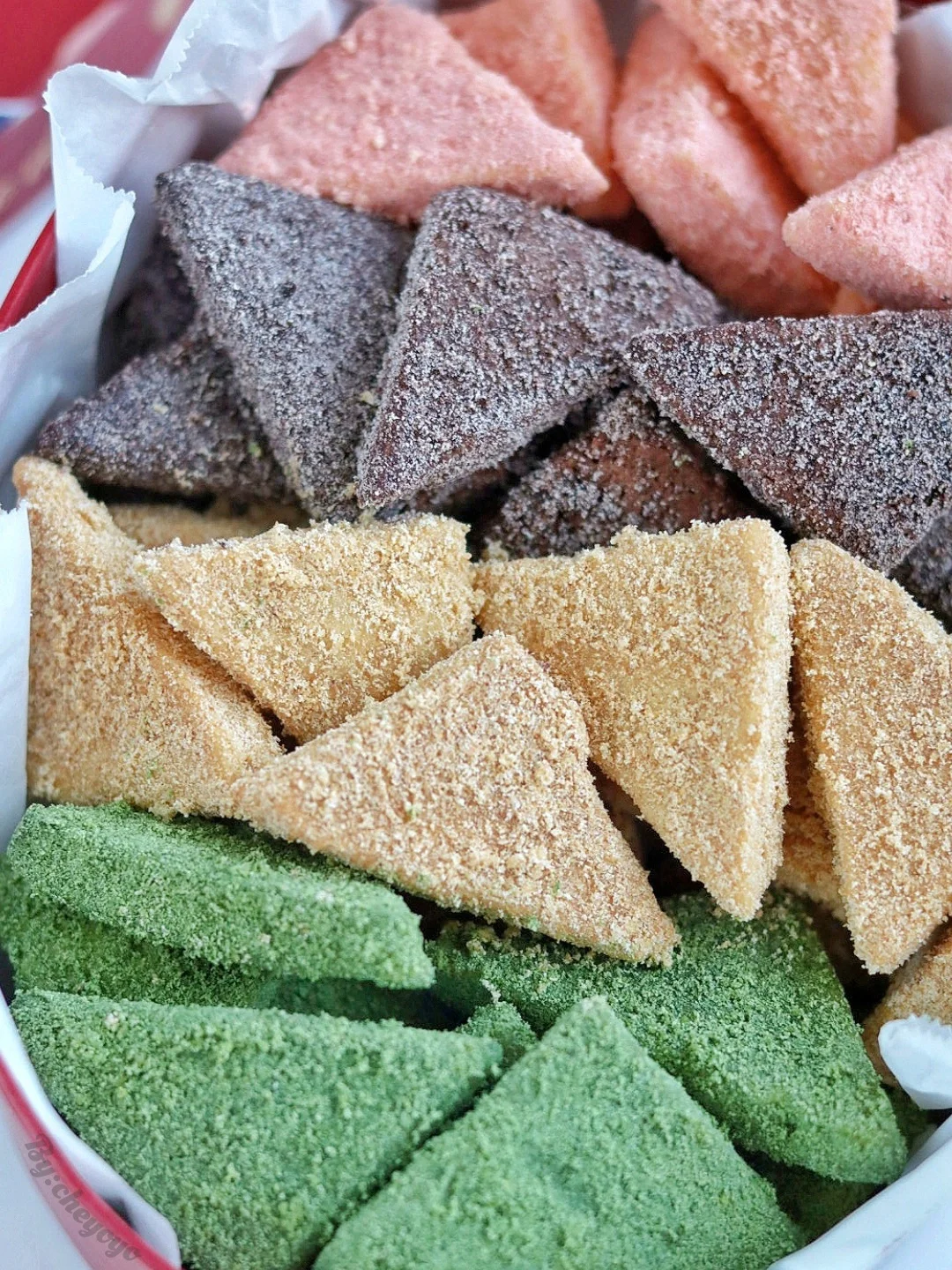 ④ 稍微晾凉(太热或太凉都不容易沾粉)的三角酥放入已混合的草莓雪绒裹粉中,沾满裹粉即可!其他口味的制作方法相同~