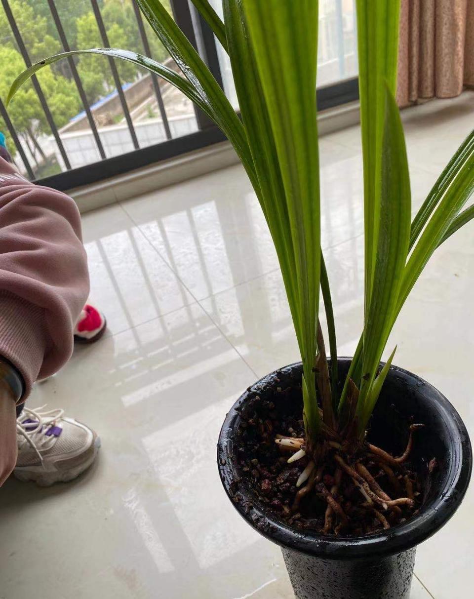 城里房子客厅新栽种两个月的一盆墨兰白墨,在浇水的时候不小心弄翻了,里面露出了4条水晶根,叶片也依旧很完美,没有发黄和发黑,说明已经成功服盆了,植料用的是松栗王兰花植料和火烧石混合后栽种的,是新配的一款植料,后面会分享给大家。