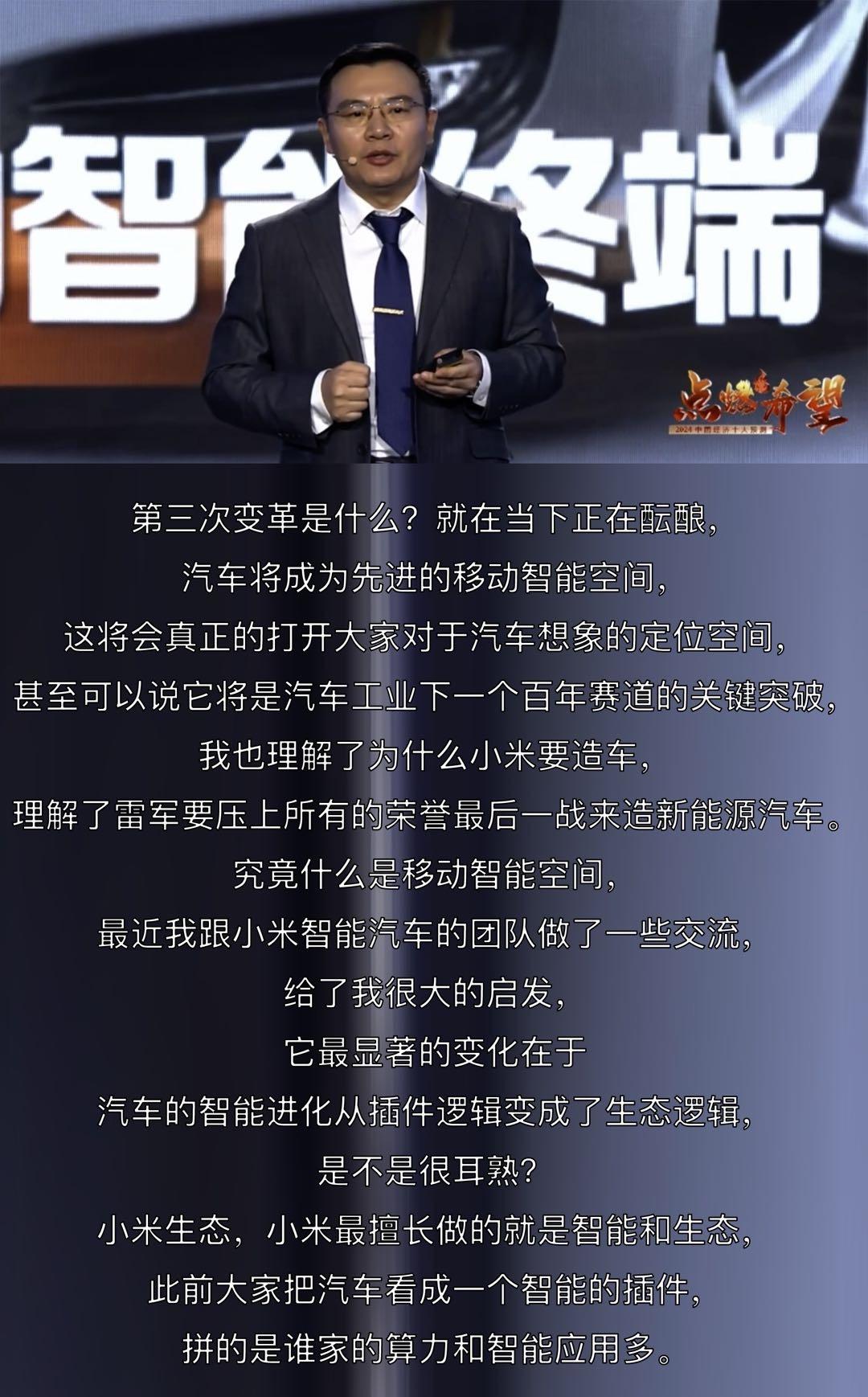 汽车行业将要迎来第三次重大产业变革,你准备好了没? 近日,任泽平在演讲中称,在汽车行业的百年发展中,已经先后经历了汽车作为“机械载具”替代了马车和汽车逐渐成为大号的“移动智能终端”的两次变革,而汽车成为先进的“移动智能空间”的第三次也马上就要来了! 在演讲中,任泽平还指出,所谓的“移动智能空间”,就是把汽车的智能进化从插件逻辑变成生态逻辑,只有生态逻辑才能够实现智能跟随每个人的需求、场景而流动。 按照任泽平的演讲,目前我国华为、小米、比亚迪等科技公司研发自己生态系统的方向是对的。就拿拥有6.55亿IoT用户人数的小米来说,小米澎湃OS的诞生,无疑把这些生态产品有机的联系到一起,形成一个全场景智能生态网,让生态中的设备实现互联互通,让人工智能的服务更加贴心,其实这就是小米所倡导的共同构建「人车家全生态」理念。 另外,首款小米汽车已经落地,只等待量产发售的那一天,至于“智能移动空间”概念如何在汽车上展现,让我们拭目以待吧!#任泽平展望新能源行业盛赞小米汽车#