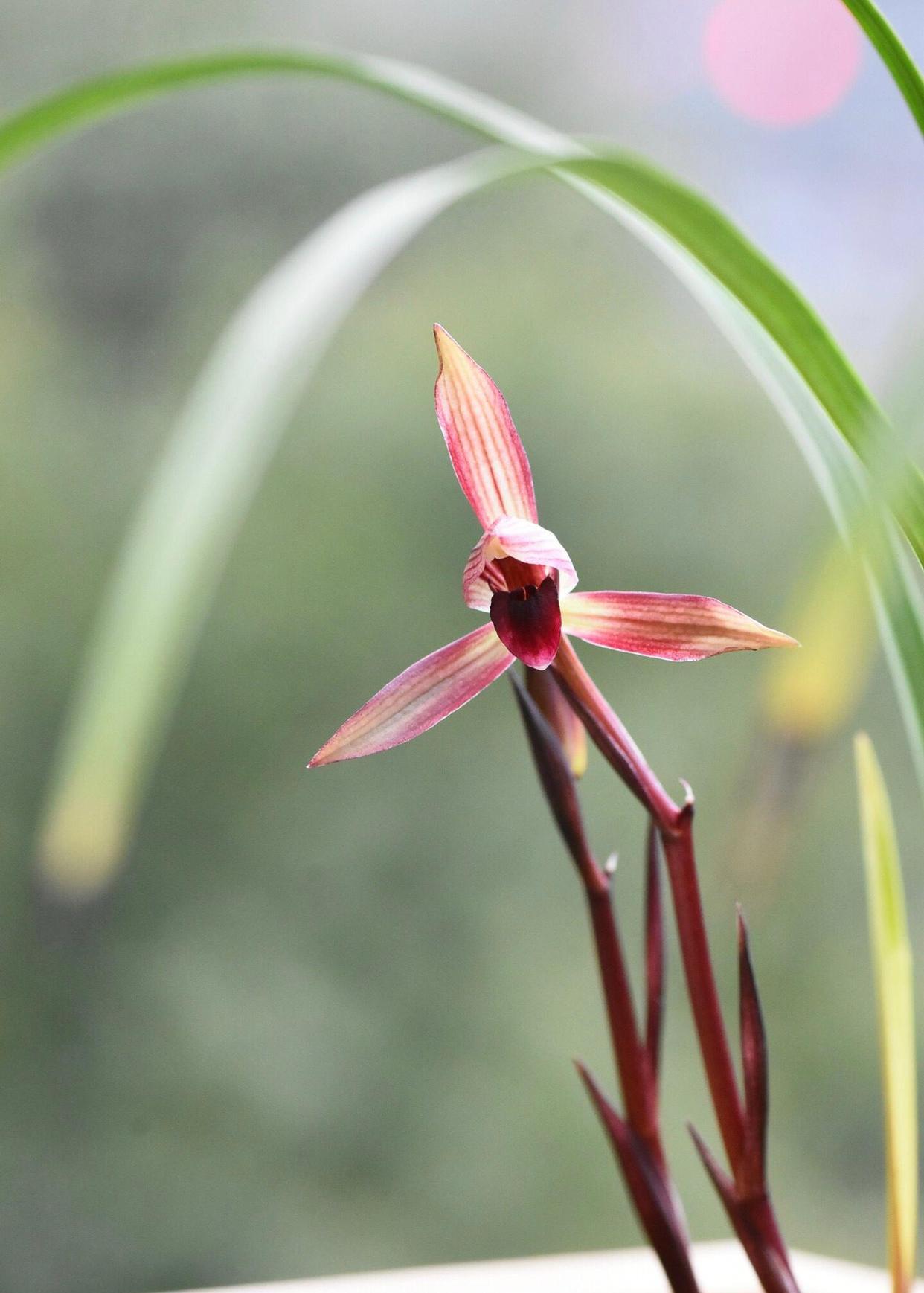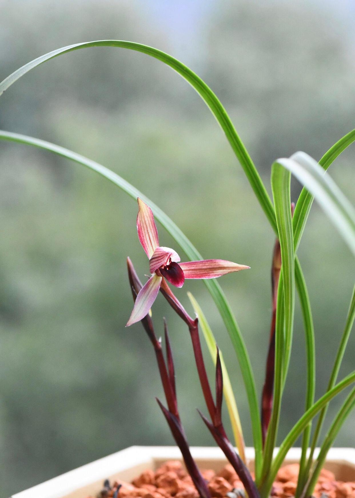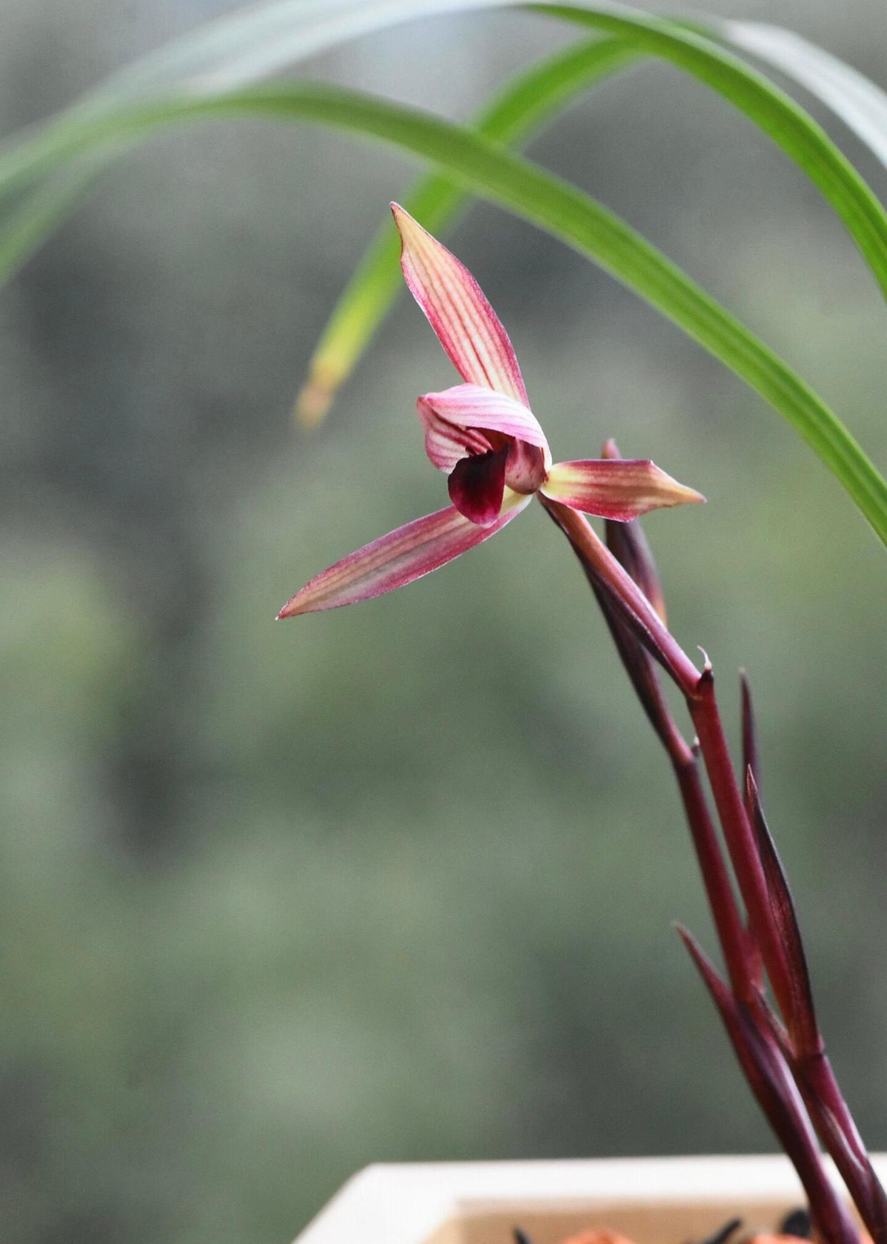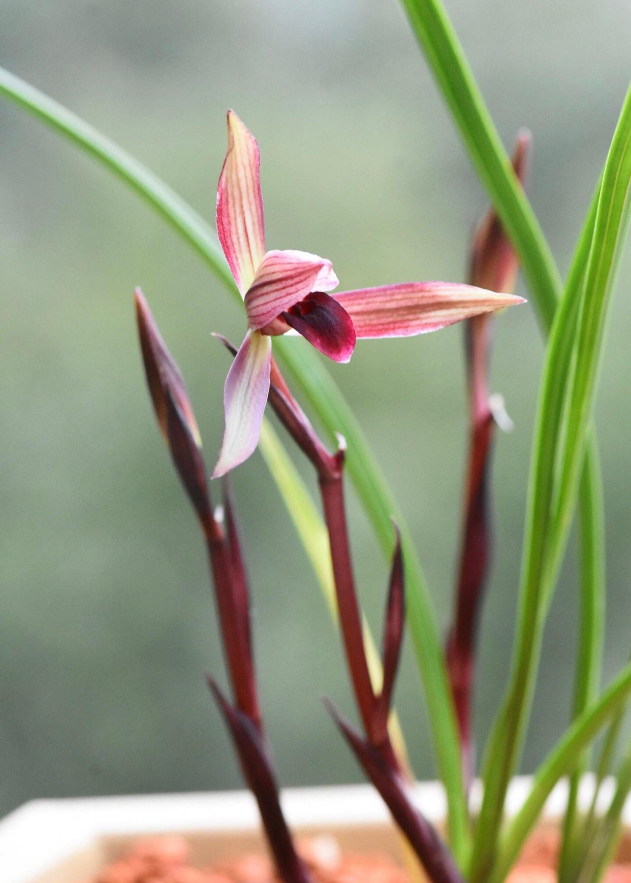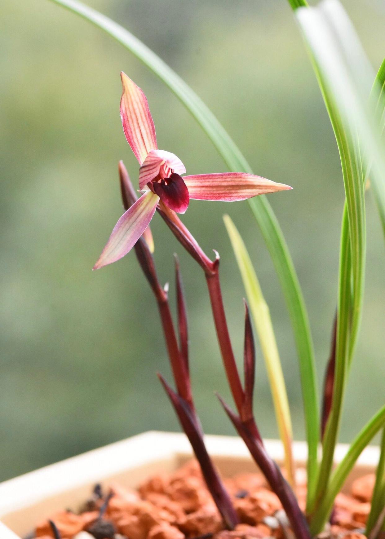 春兰滇红素,2004年出自云南省景东县,滇是云南的简称,用滇起头命名,说明它是云南春兰红素中的佼佼者,其花瓣水红色,不开捧,舌色穿板,鲜红无杂色,花梗和苞衣同样鲜红,有香味,非常不错的红花红素品种。