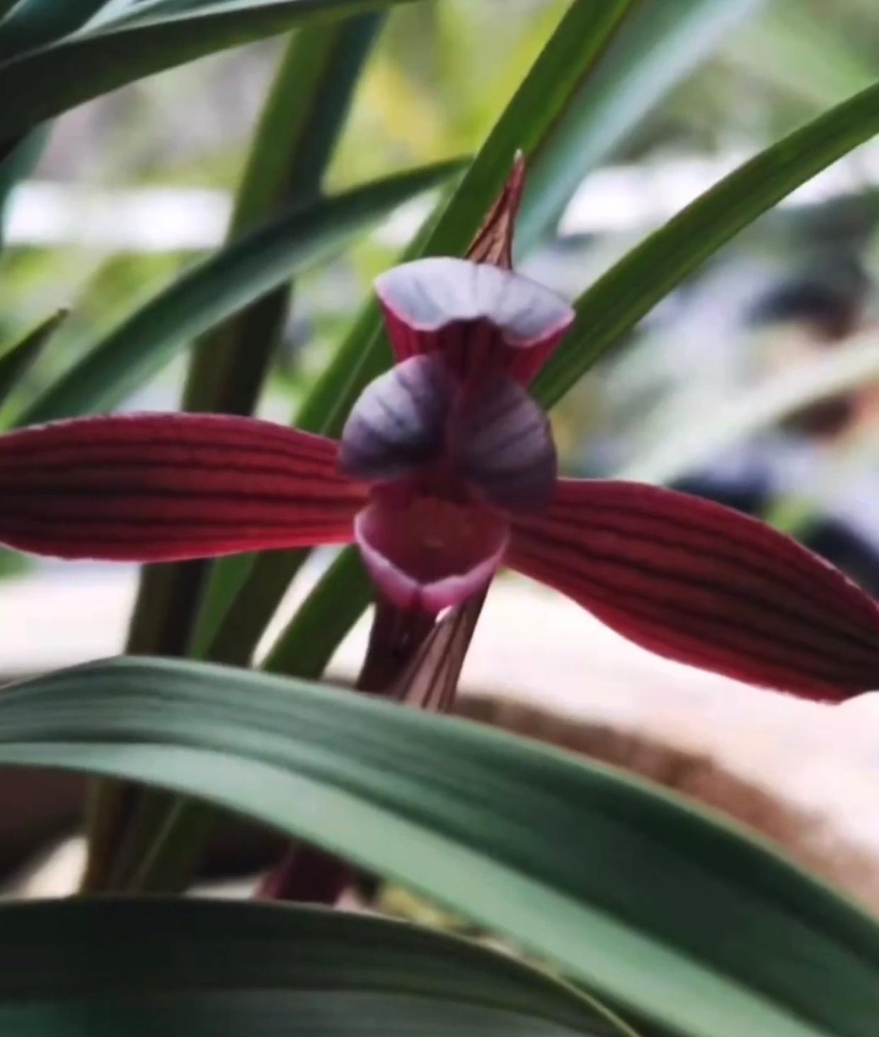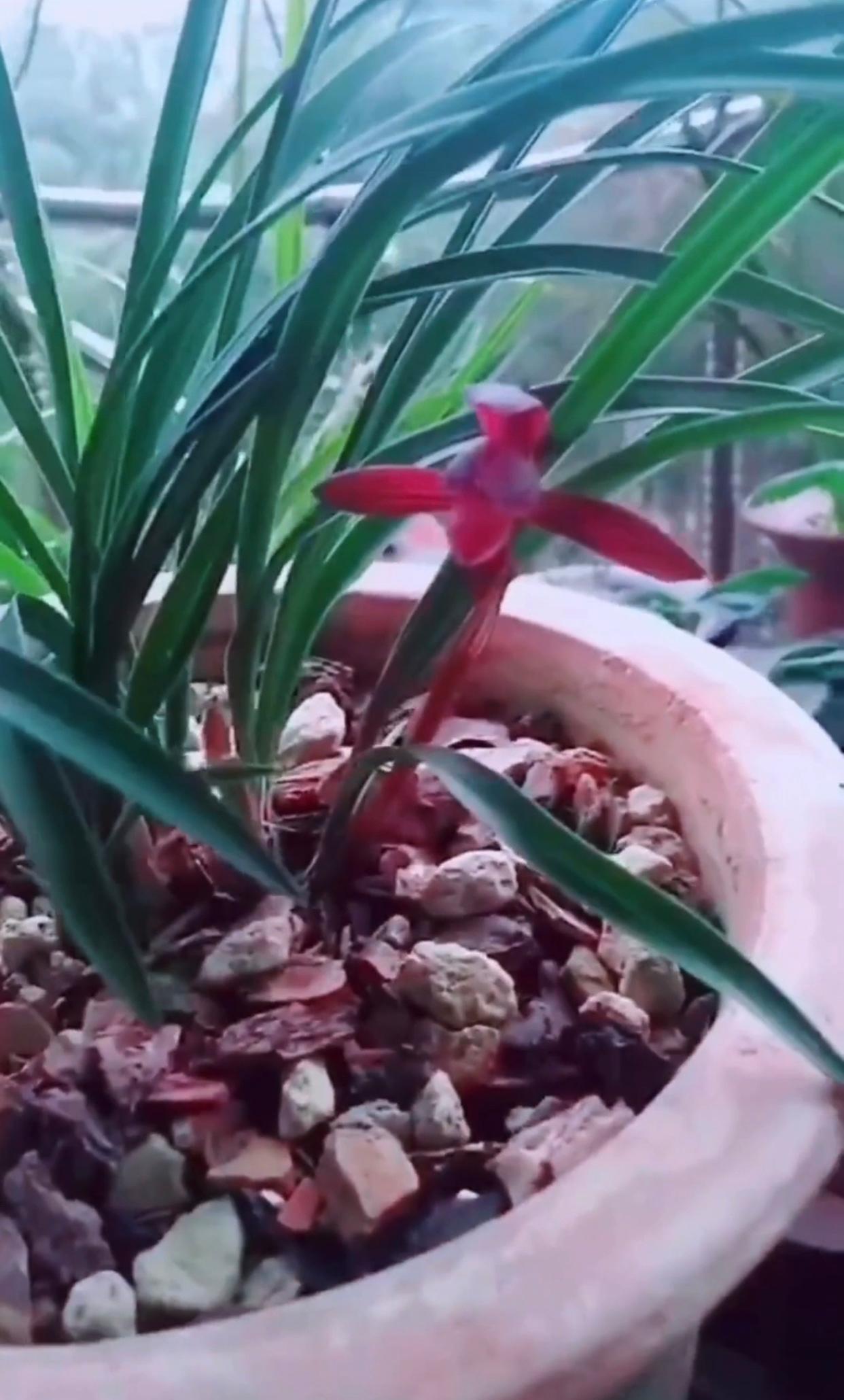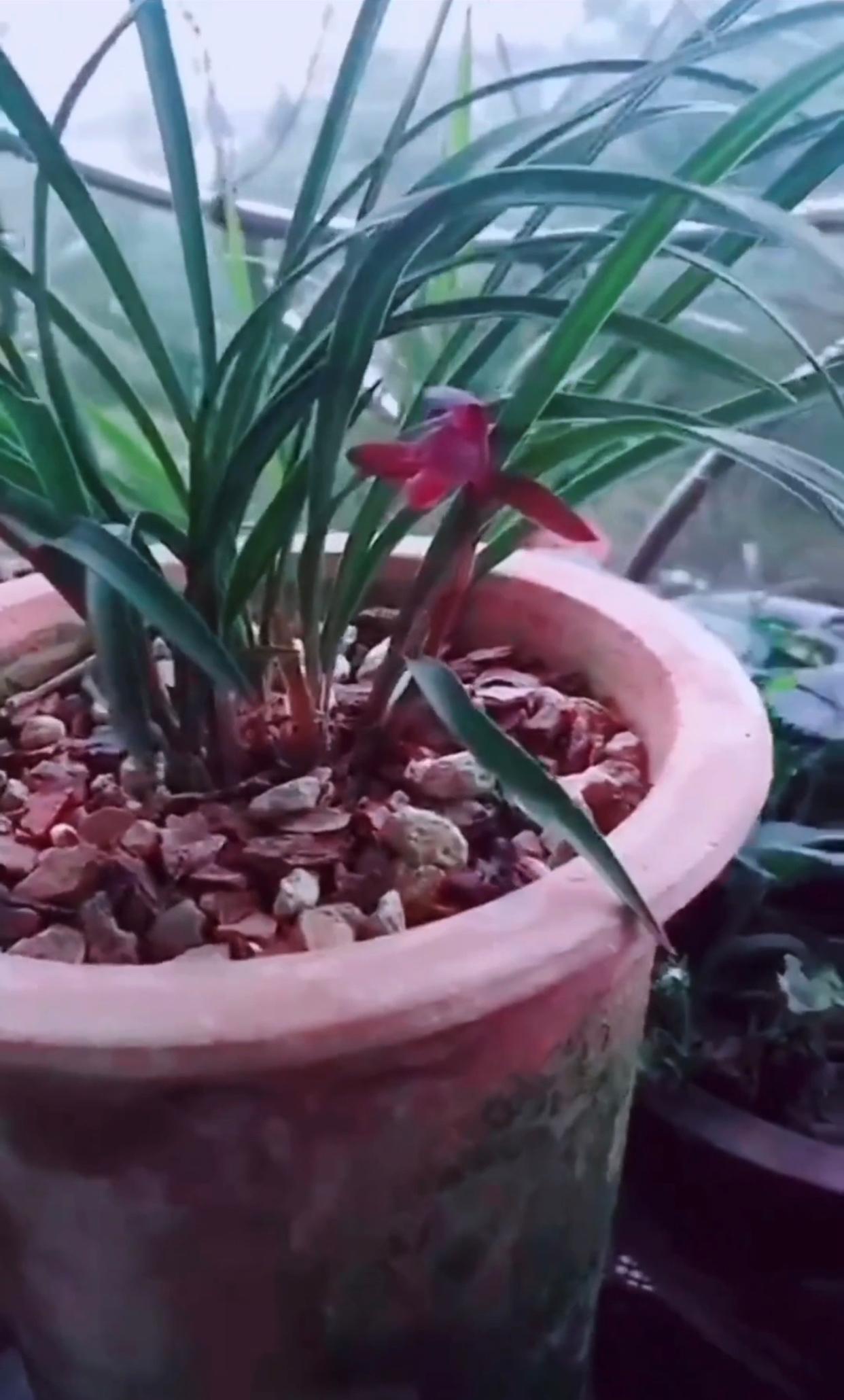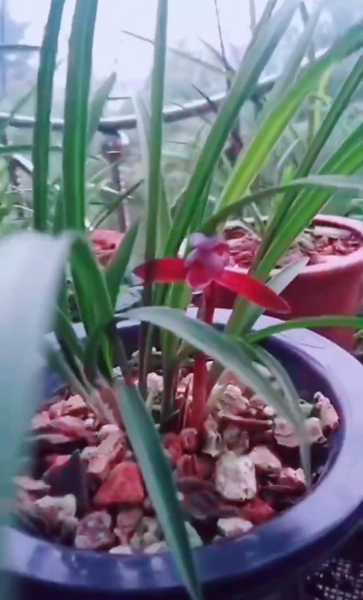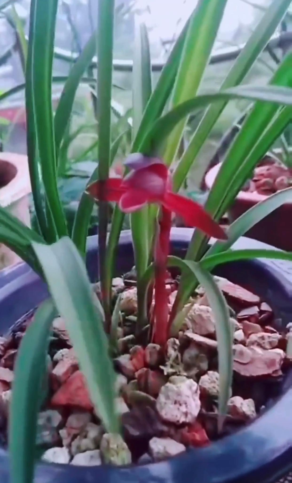 春兰红云,红花红素品种,有香味,其花瓣黑紫红色,捧瓣抱合,舌瓣厚实,平铺下挂,舌色桃红,无杂色,花杆黑紫红色,出自贵州省遵义市湄潭县,亓心清选育。