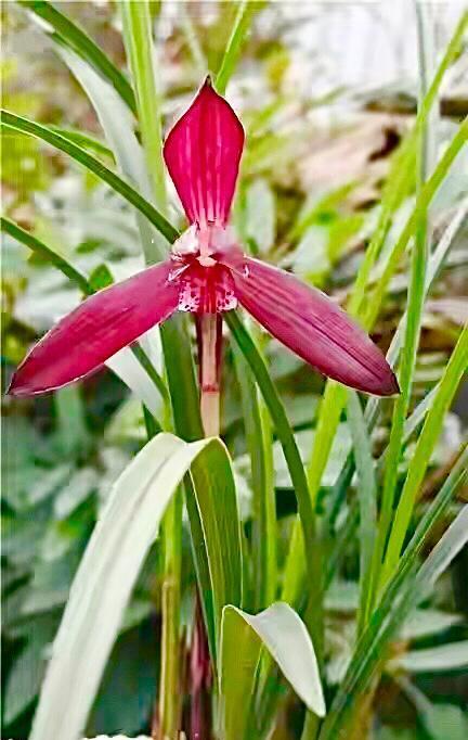 春兰娄山红,红花品种,其花色深红,如宝石般厚重,会随花期进行逐步加深,可谓是红得发紫,红得发黑,花瓣厚实,捧瓣前伸,舌瓣白色,遍布深红色小斑块,花梗黄绿泛麻,苞衣紫红色,有香味,2001年出自贵州娄山关。