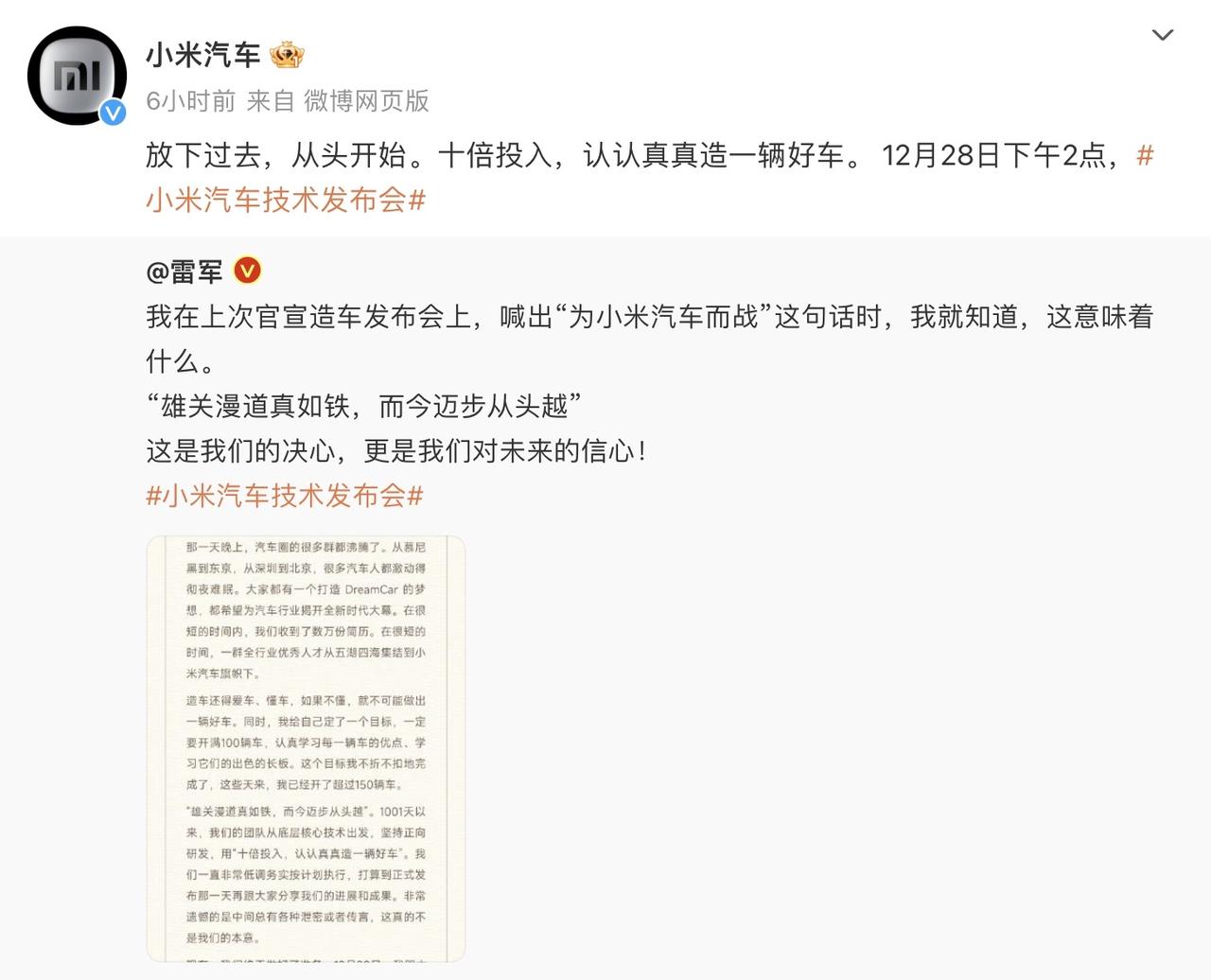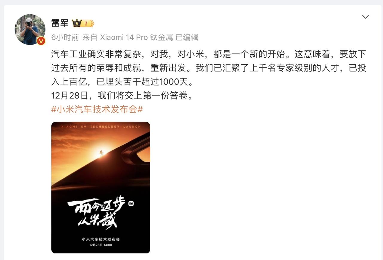 正所谓“知己知彼方能百战百胜”,为了更好的造车,雷军居然开了超过150辆车。 咱们有一说一,雷总的学习能力、创新能力以及魄力真的是让人钦佩。宣布造车后,雷总放低姿态,抛开过往的一切荣辱,从头做起,以“小学生”的身份开始了自己最后的梦想拼搏,如此谦虚的态度也是难能可贵,毕竟身家过亿才能有如此清醒的认识,难怪小米会连续多年成为世界500强。 雷总为了取众家之所长,造出完美的汽车,立下了要开满100辆车的Flag,谁知道用力过猛,超额完成了任务,150辆车的实际驾驶体验,真的会成为小米汽车成功的重要基础。 此外,雷总深知脚踏实地做科研的重要性,小米汽车从成立之初就一直低调务实的按计划执行,为每个期待小米汽车的粉丝创造出更大的惊喜。然而,谁知道这次小米汽车出现了美中不足,那就是遇到了“猪队友”,小米汽车的外观被早早曝光。 塞翁失马焉知非福,虽然发布会上的惊喜度降低,但是运动风味道十足的设计,让每个年轻人怦然心动,这样会让很多人变成等等党,毕竟看完如此高端气质的汽车,很难不会种草,大家说是不是?#雷军自爆3年试驾超过150辆车#