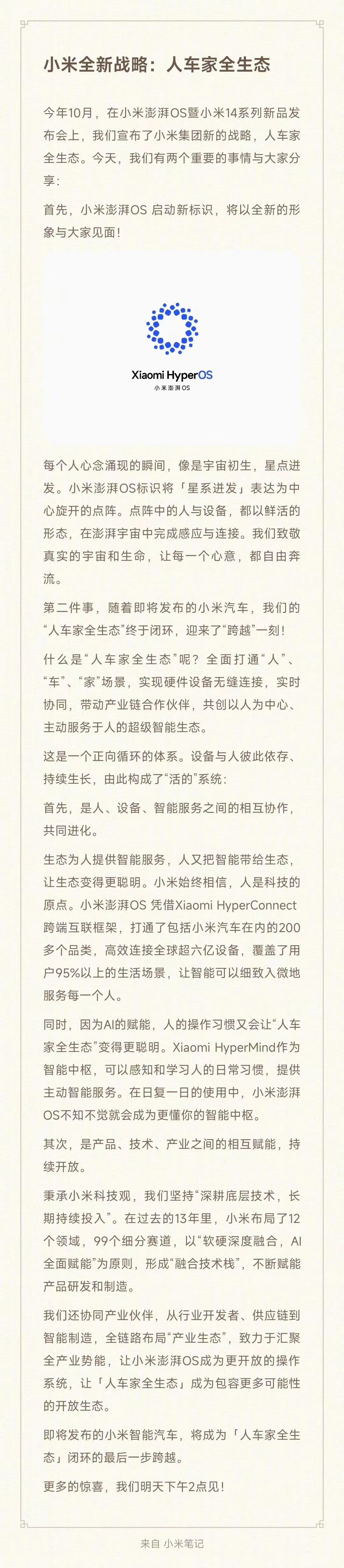 小米汽车技术发布会前,雷总又释放两个信息: 一是,小米澎湃OS的新标识将要被启动,新标识由大小不一的小方块围成,如果我们把小方块想象成为小星星,那围成的形状就是星系,那就有种包罗万象的寓意,雷总说新标识是在致敬真实的宇宙和生命,而我认为这是在表达小米澎湃OS万物互联的特点; 二是,小米汽车一经发布,小米将实现“人车家全生态”闭环,这也就是海报上跨越两字的出处。大家众所周知,全面构造人车家三者之间的联系,实现硬件之间的无缝对接,从而真正实现万物协同、万物互联, 客观来说,小米作为目前全球IoT拥有数量最多的科技公司,这是小米能够实现万物互联的重要基础,毕竟只有通过把IoT产品有机的结合在一起,才能够真正实现闭环,让智能细致入微地服务每一个人。Xiaomi HyperMind作为智能中枢自学习功能,通过提供主动智能服务,让澎湃OS的体验更加贴合实际,更懂消费者。 另外,小米通过深耕13年,已经布局12个领域,99个细分赛道,秉承着以软硬深度融合,AI全面赋能”的原则,形成“融合技术栈,从而构建不断赋能产品研发和制造的技术生态。小米还在布局全链路的产业生态,让「人车家全生态」成为包容更多可能性的开放生态,看来小米汽车发布只是新的开始,而不是结束,人车家全生态的实现之路任重而道远! #雷军谈人车家全生态# #小米澎湃OS新logo# #雷军发文解读“人车家全生态”#