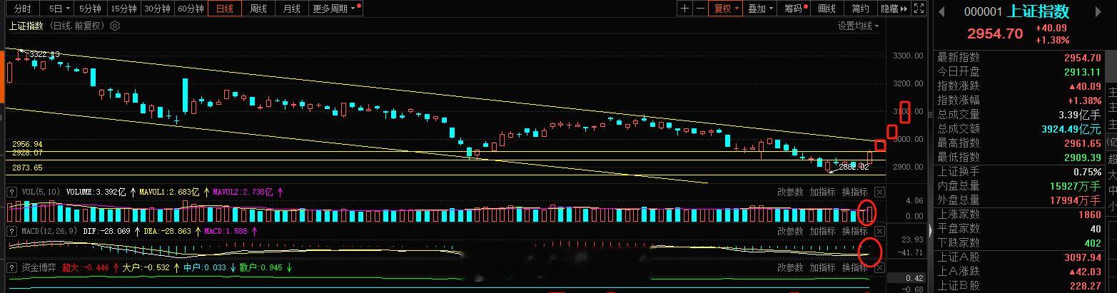 上证指数今日指标共振看多,放量的大涨安全了,2882点年前的低点了,接下来的年底红包行情来了,我已经准备好了