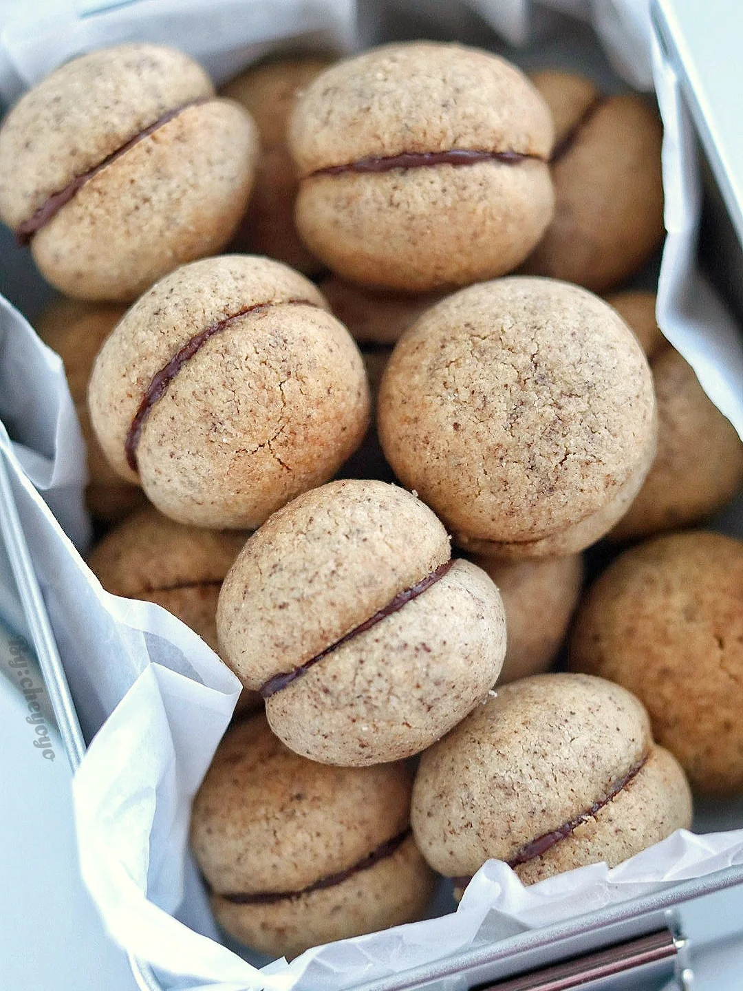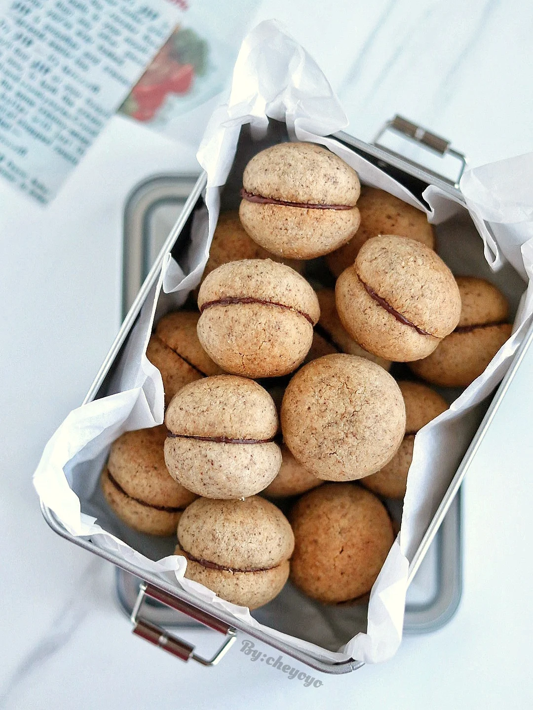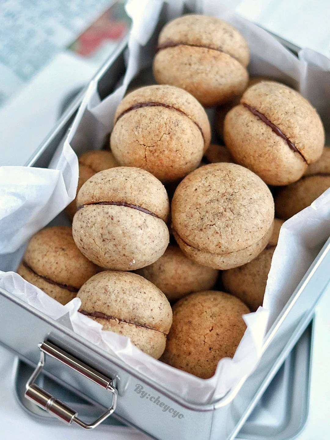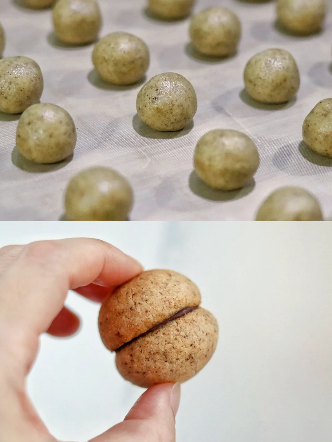 3⃣️ 分成9g/份,滚圆后均匀摆在铺好油纸的烤盘上,送入160度烤箱烘烤18分钟;