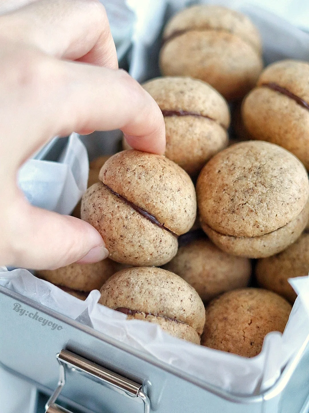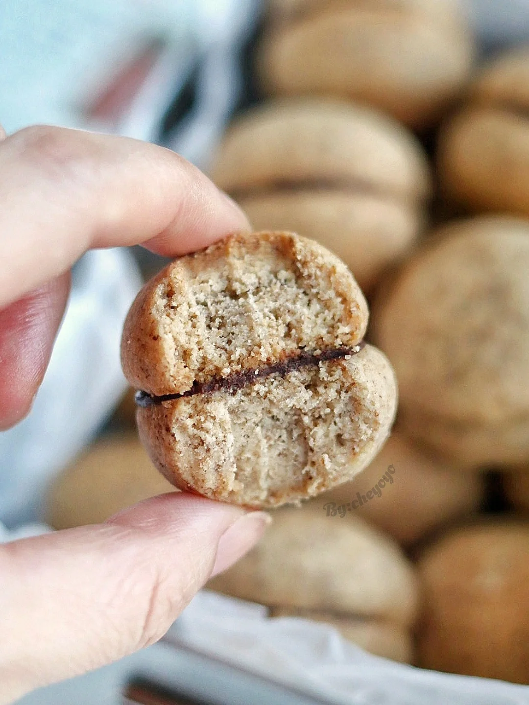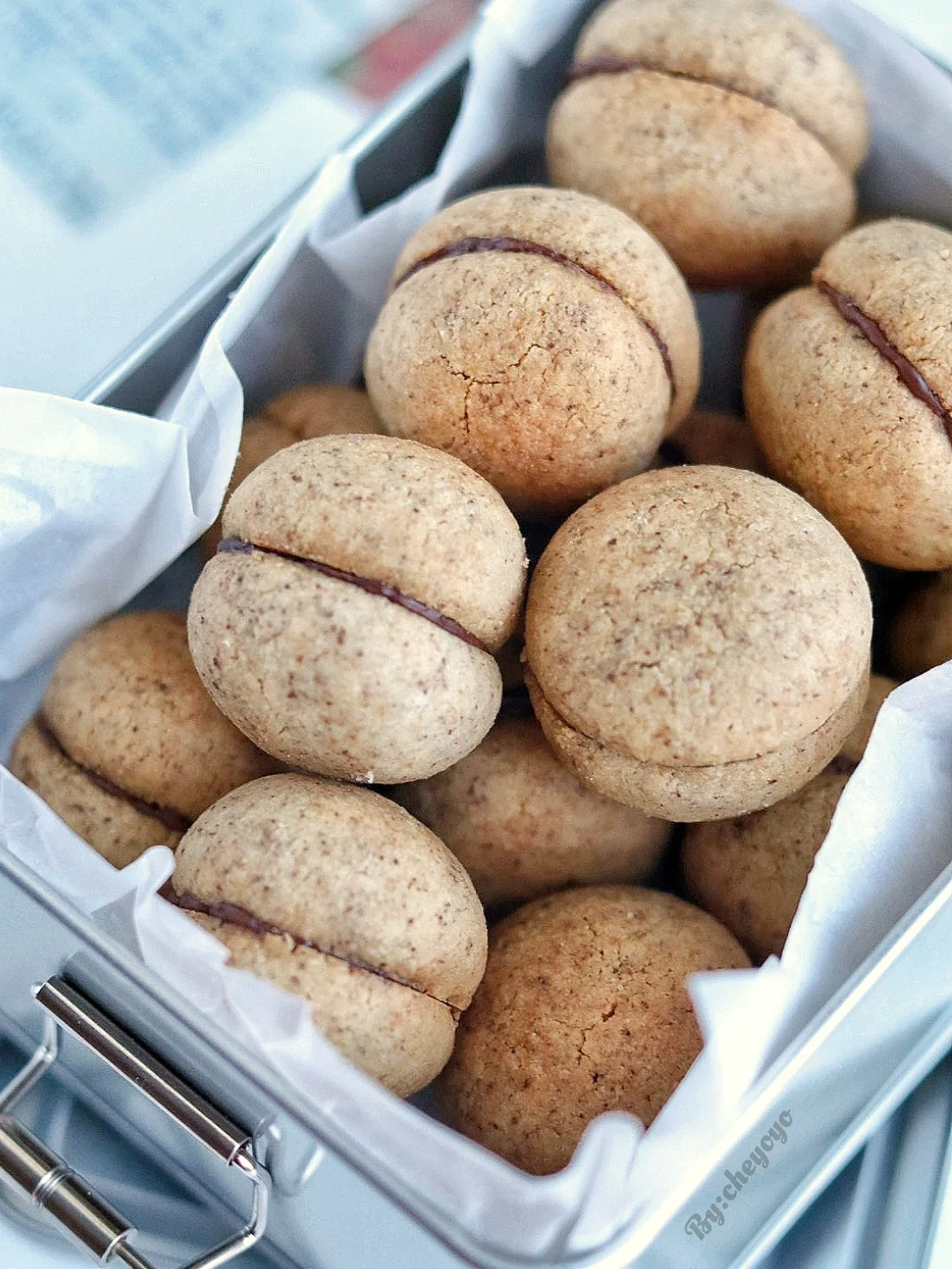 4⃣️ 巧克力装入裱花袋中隔热水融化,当做粘合剂将两块曲奇饼干底部粘在一起就可以啦🌝🌝