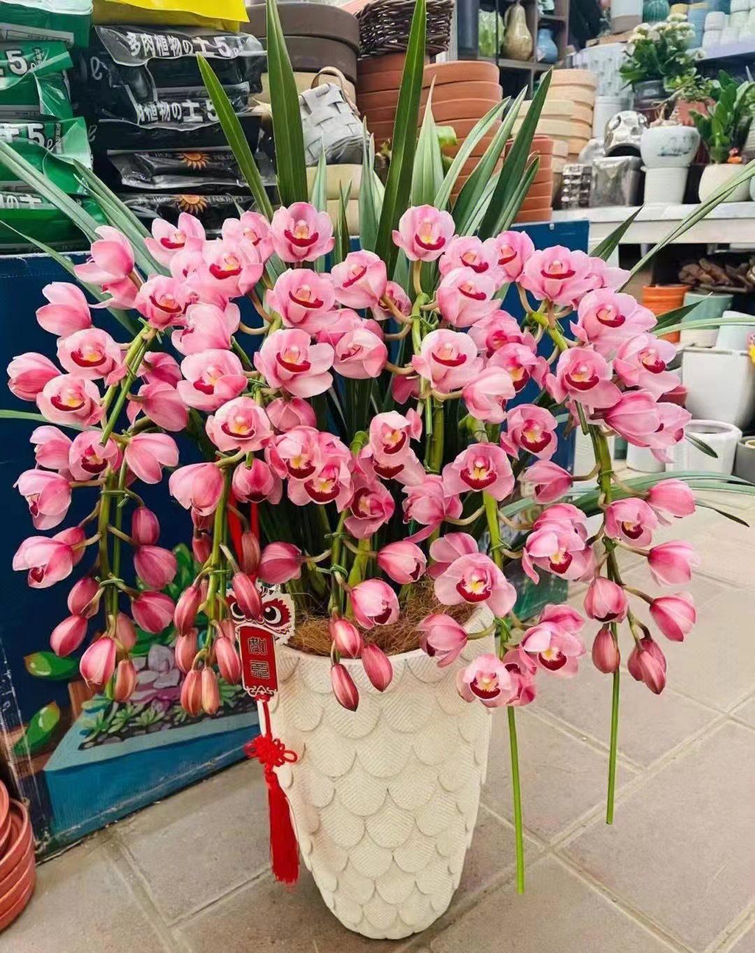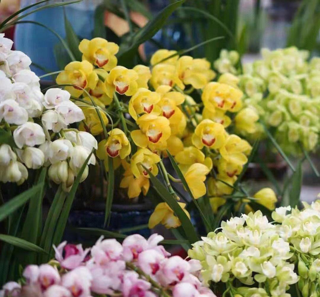 大花蕙兰是兰科兰属附生草本植物,它寓意丰盛祥和、富贵吉祥,花期能从10月份开到第二年4月份,是近几年很受大家喜爱的年宵花卉。 它植株雄伟挺拔,株型典雅大方,纤长秀丽的花茎或直立或下垂,硕大的花朵色彩艳丽、异彩纷呈,花型整齐而美观,观赏价值非常高,是一款高品位的豪华高雅型兰花。 大花蕙兰对温度的要求不算太严,既可以耐一定的高温,也能耐短时间的低温环境,不过冬天若气温长期低于5度,则叶片容易因受冷泛黄、花期也会推迟;气温若长期低于2~3度,则容易发生冻害,花苞变黄、不能开放;所以冬天养护它,最好温室养护,室温最好保持在8~15度,且昼夜温差最好保持在8度左右,这样对植株的开花有一定的好处。