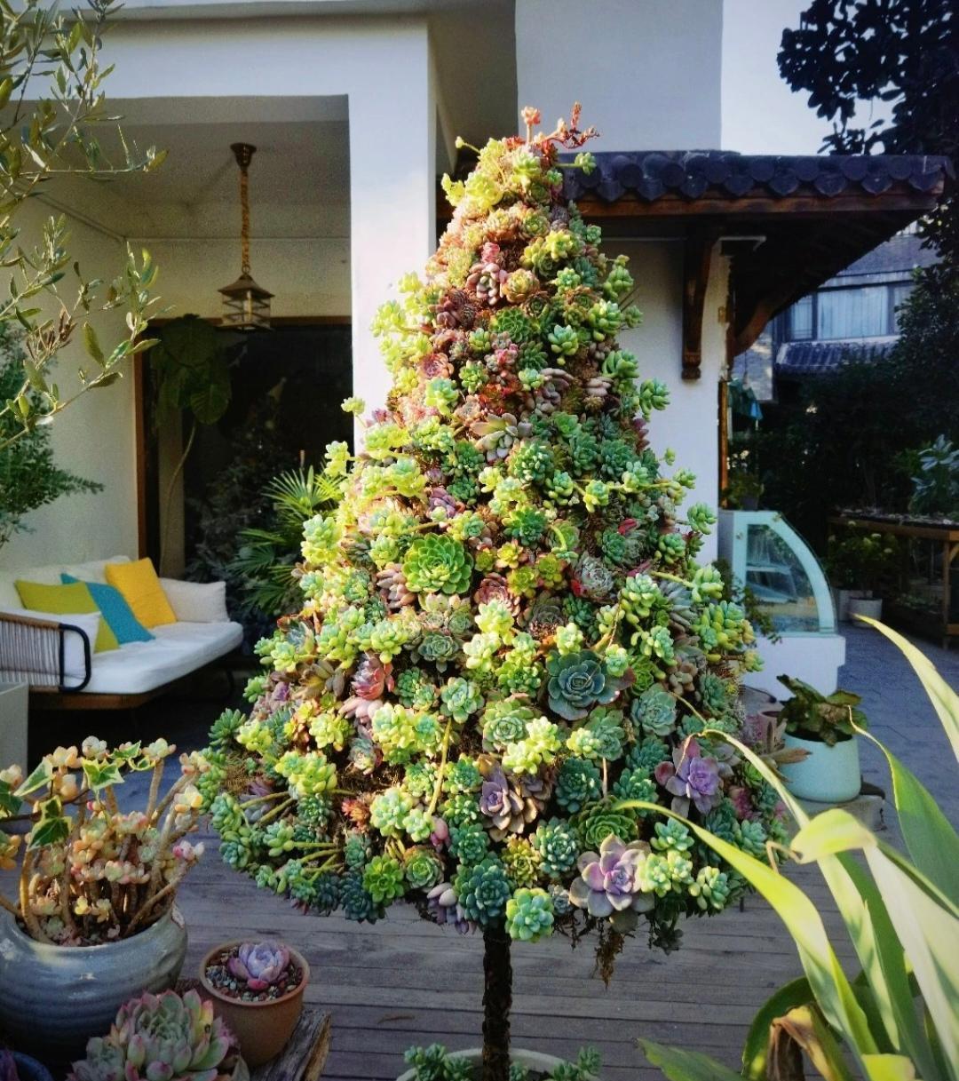 大千世界,无奇不有 这样的多肉圣诞树,你见过吗? 俗话说得好 养花的最高境界 不是养很多很多种类的花 而是把一种花养出“不平凡”的样子 这位小伙子做到了 真的太美了 超级羡慕啊 小伙子是一位多肉爱好者, 又在适合多肉生长的云南, 他都会想法把多肉打造成不同的形态, 他说, 看一棵一棵的小肉肉, 在自己的手里呈现不同的美, 成就感满满,减压又治愈, 每天工作之余, 他就喜欢在自家的多肉花园里, 浇水施肥,清除落叶, 这里看看,哪里看看,安宁又舒适 diy一棵全球肉圣诞树是圣诞节前后的“奇思妙想”,小伙子是一位行动派,有了想法就会去执行,最后看着成行的多肉圣诞树,他的心里无比的幸福。 下面分享一下小伙子制作多肉圣诞树的过程。 先找人定制了,一个树形的铁艺架子,只有底下有一点份量就行,然后去五金店围着制作一圈支架,下宽上窄,有“树”的形态。 然后用水苔把圣诞树中间填满,再用鸡笼网给包起来,水苔即可以吸收水分,还可以多给多肉的根部提供水分,所以浇水的时候,大水漫灌,也不会积水烂根,再加入是室外养的多肉,在冬天的云南,太适合这些肉肉的生长,很快就能呈现出它们独特的美。 小伙子说,多肉长势太快了,到了夏天就需要把一些生长比较密集的多肉拔掉一些,不让多肉之间有缝隙,这样子就不会因为不透气而黑腐了,而且还能利于多肉的生长。