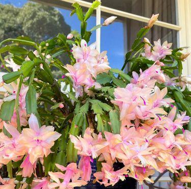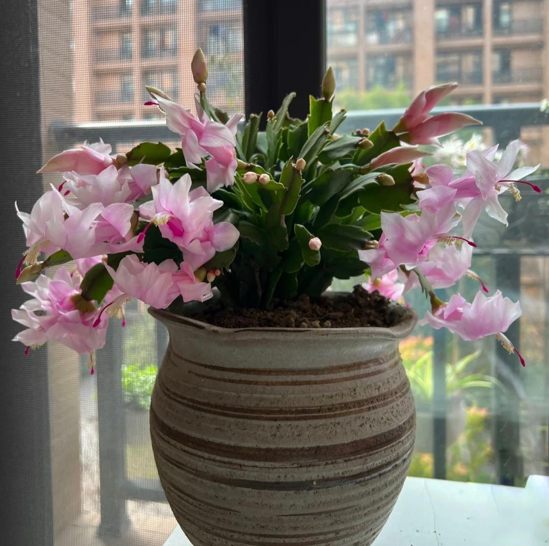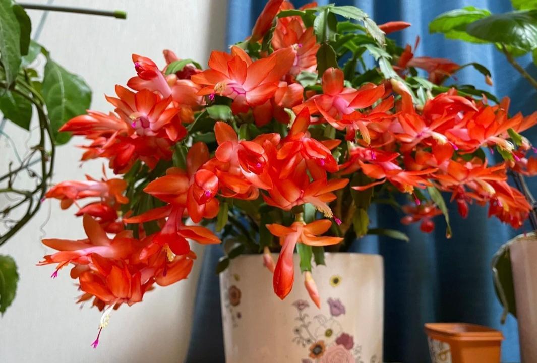 冬春时节开花“小机器”,你有吗? 它就是蟹爪兰 蟹爪兰,品种多,花色丰富 一茬花可以持续开三十天左右,从秋到暮春浅夏,都是它的花期 它的花色是那种非常饱满亮丽的花色,家里放一盆,看起来特别的明媚靓丽, 花枝下垂,飘逸除尘,有一种温馨浪漫的感觉 蟹爪兰极怕积水,水一多,土壤过于潮湿,透气一差,它就会烂根,从下往上烂,这也是很多人养不好蟹爪兰的原因 想要养好蟹爪兰,建议用小盆,易控水,根更壮 冬春需要多晒太阳,除了夏天高温时节,不能多晒,其它的时候,越晒它的开花能力越强,当然合理施肥,花更多