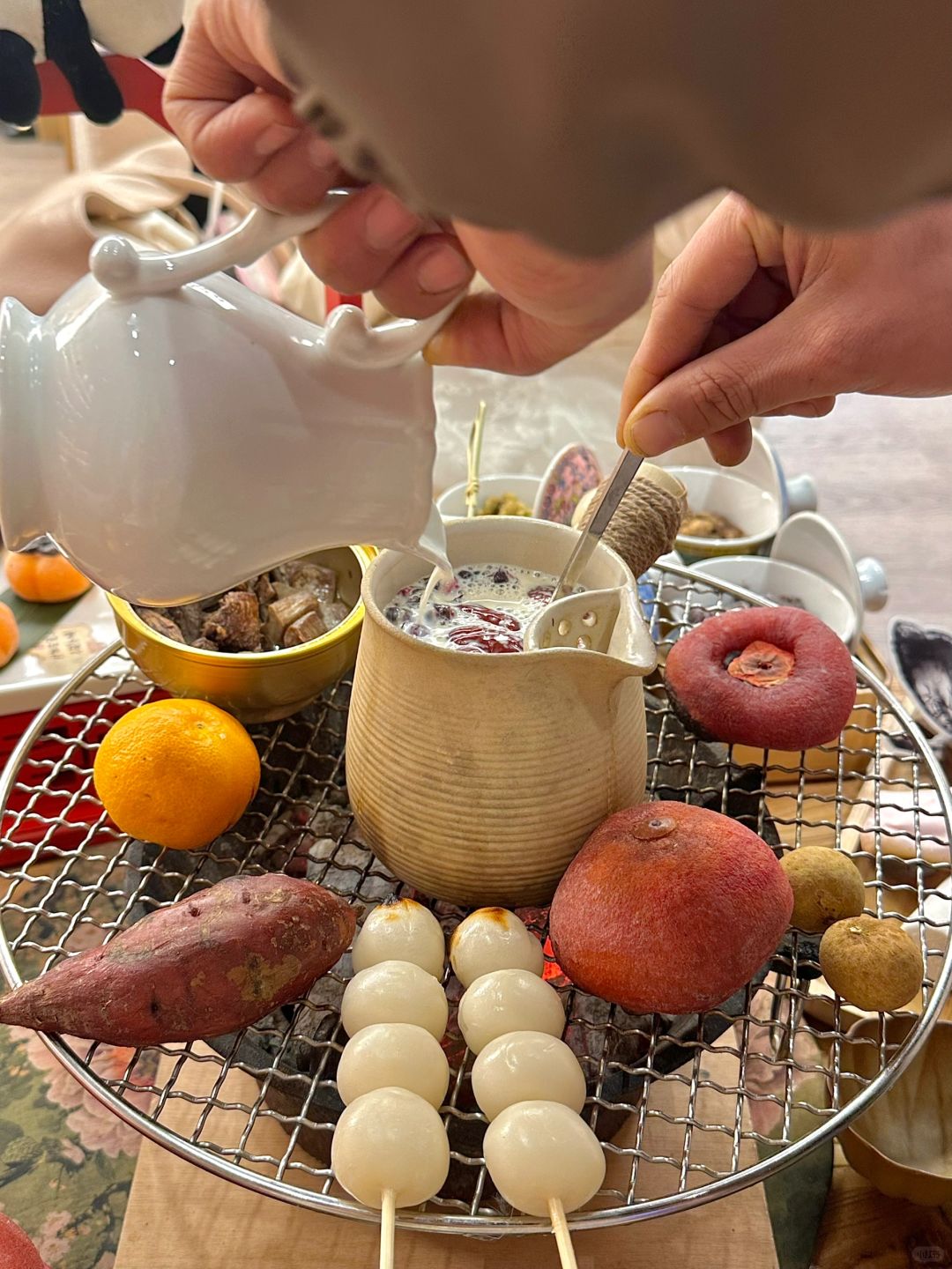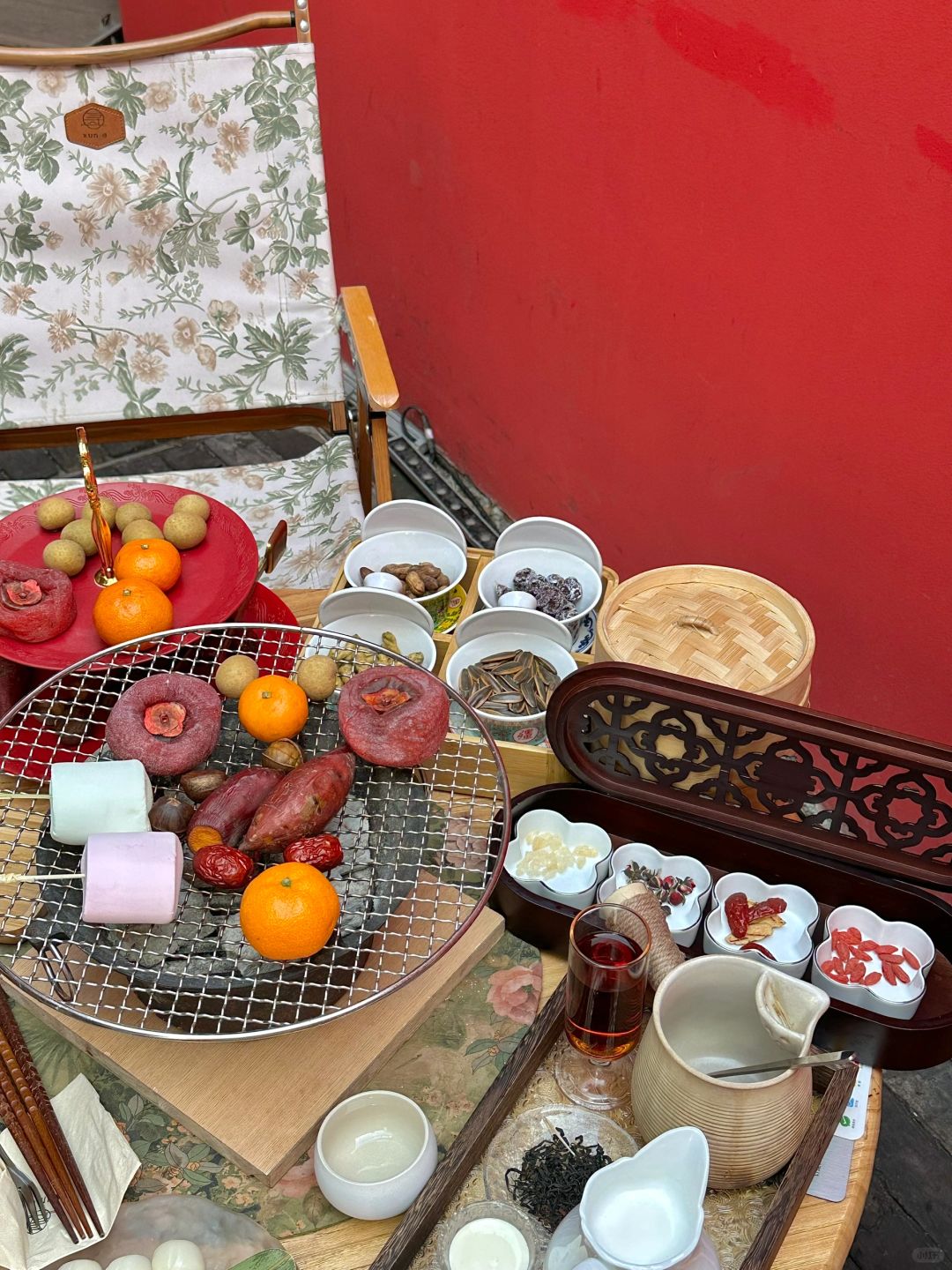 不管是阴雨绵绵🌧️还是风和日丽☀️都好像与围炉煮茶挺搭的~这家茶馆🍵真的挺合适的 能拍照的地方好多!分室内室外 室外位置还有烤炉冬天也不会太冷喔 品尝精致的茶点🫖烤小丸子🍡好吃 沾上红糖液 甜甜的 喝喝茶水或者现煮鲜奶茶🧋再拍拍照 感觉下午时间过得飞快~太惬意😌的生活了