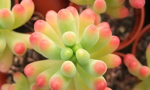 多肉乙女心 要说上色快,乙女心是必须要说的一款多肉了 它对养护环境d的变化非常的敏感 当光照不足时,它立马褪色并且徒长 但是只要晒几天大太阳,它的红尖尖很快就回来了 所以它是一款上色的速度非常的快,但是褪色也特别快的多肉。
