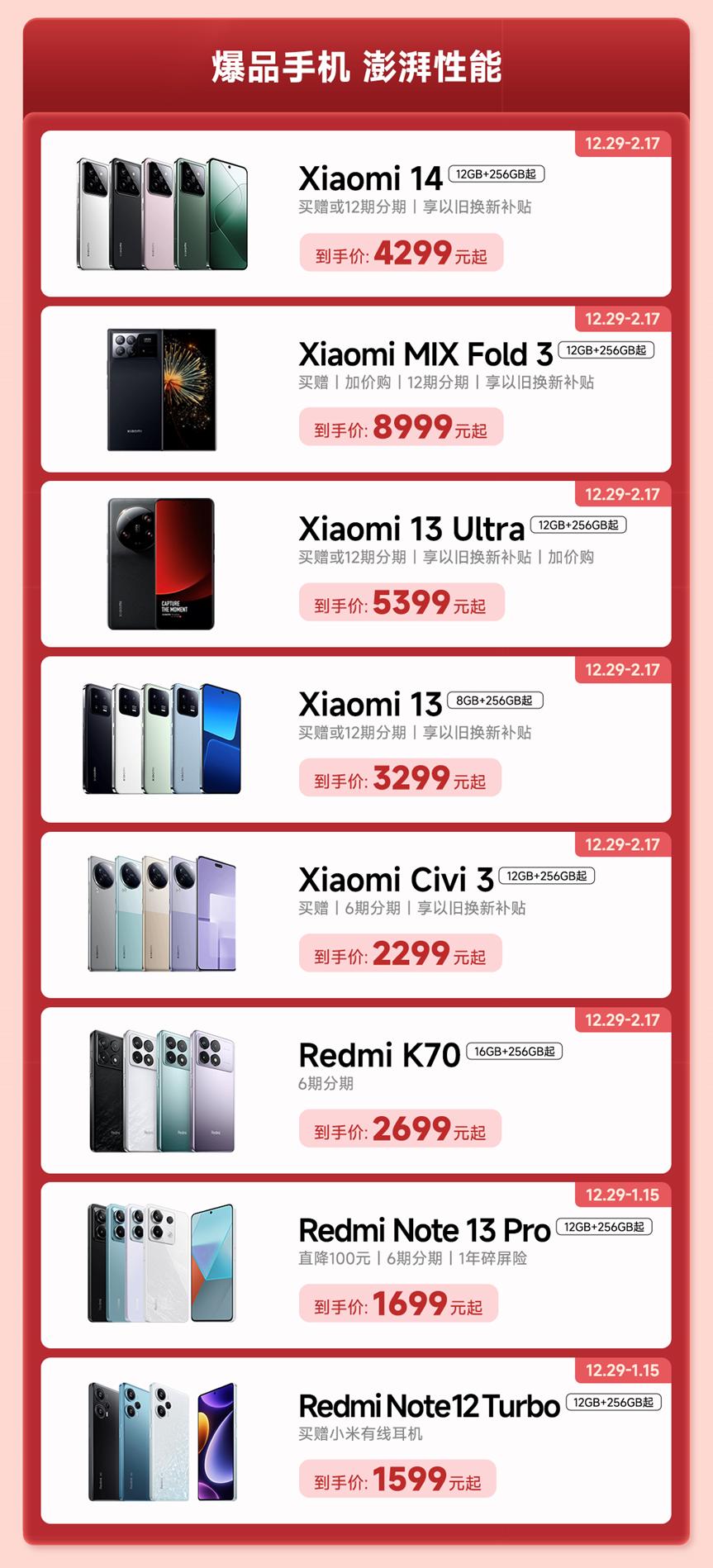 确实有些秃然,小米科技年货节这就澎湃开启,主打一个「人车家全生态」智能生活带回家。 2024年伊始小米就放大招,隆重推出100万份科技好礼以及最高800元的券包,其中发布不久的小米14和小米MIX Fold3均可享受以旧换新的补贴,最高24期免息分期,就连14天销量100万部的Redmi K70也会享受最高6期免息分期,足见小米这次活动的诚意。 智能可穿戴品类中,质感高端、性能多样,并且搭载小米澎湃OS的Xiaomi Watch S3也位列其中。另外,Xiaomi骨传导耳机到手价不足500,性价比再次提高。 为了突显智能家居的概念,小米电视、空调、冰箱、洗衣机等大家电产品也有大幅优惠,其中小米电视S Pro 65 Mini LED 65英寸直降700元;米家冰箱十字518L超薄平嵌最高直降500元;米家洗烘一体机尊享版10kg直降500元,为了让价格更卷,还能叠加100元优惠券以及享受以旧换新补贴优惠,这波羊毛不薅,真的要等一年了! 另外,从1月12日开始,小米还会推出万店迎新年活动,在活动期间线下消费的用户可以免费领取一份新年礼物,想春节换机的小伙伴不妨去康康!