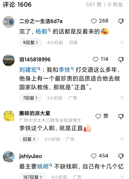 杨毅有点话说多了,他说跟姚明认识小30年,知道他热爱篮球,对待篮球事业非常认真,说篮球圈还是有底线的,知道哪些事不能做。原本这事没人提,这下好了杨毅大嘴巴一叭叭,评论区有人说杨毅说话都是反着来的,还有人举例刘建宏跟李铁打交道这么多年,他身上有一个很珍贵的品质就是“正直”。