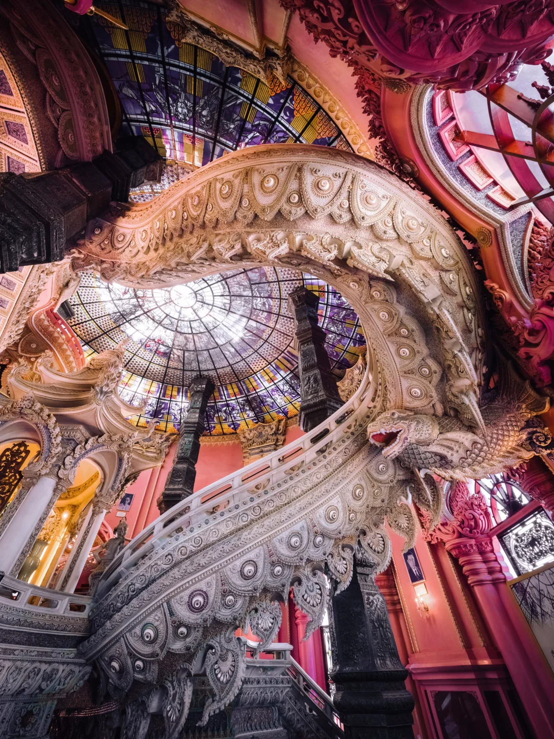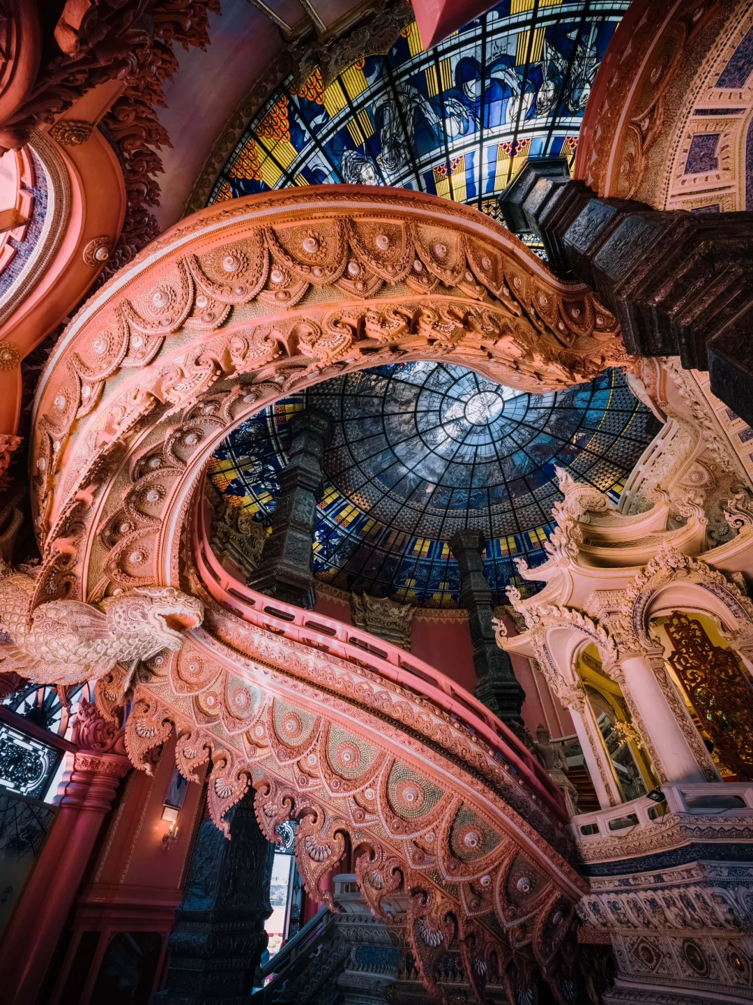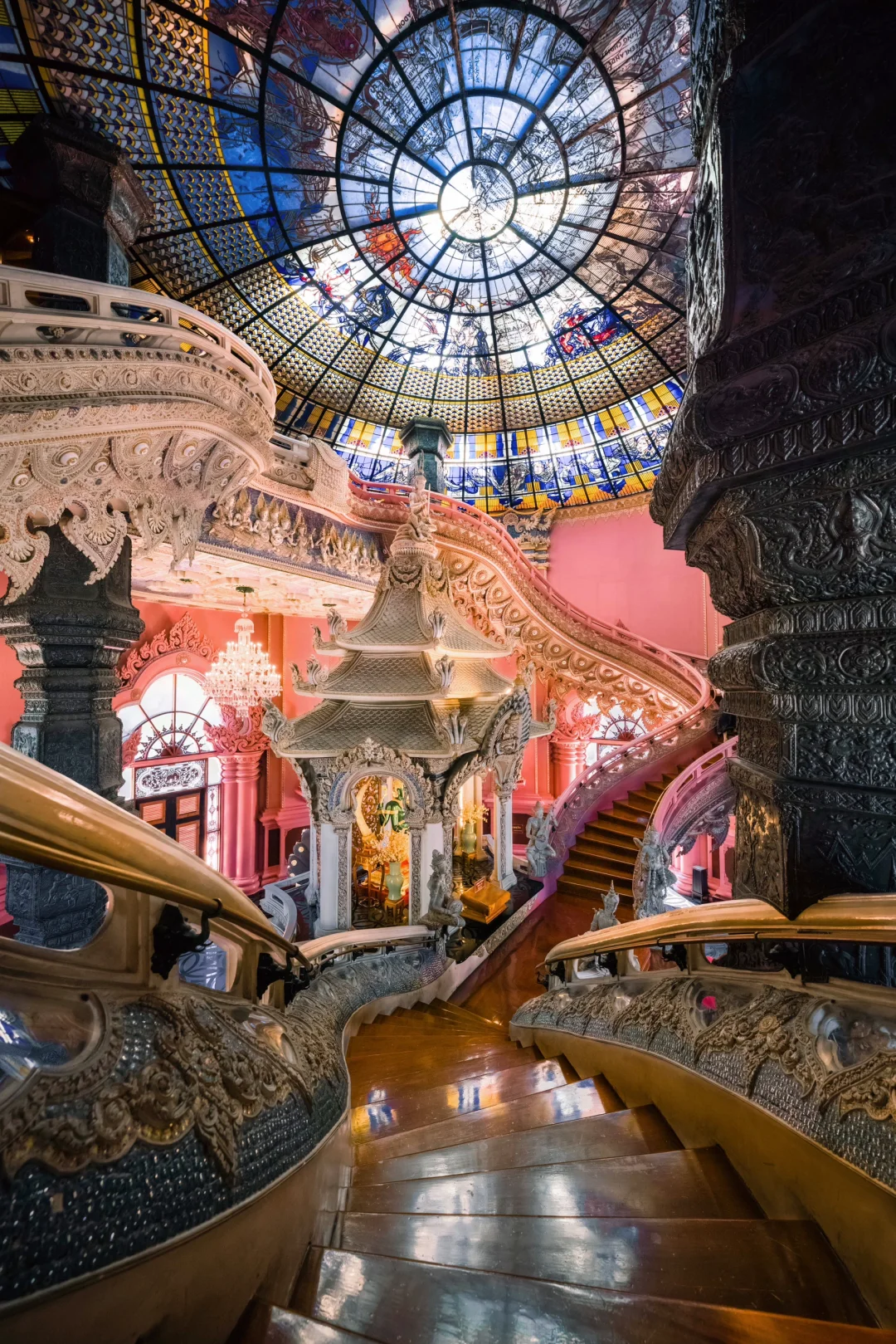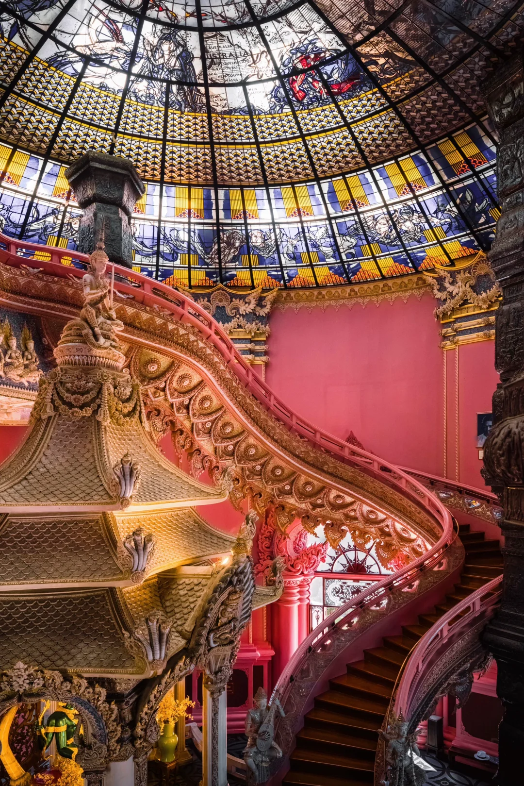 我是几奈,坐标上海的90后摄影博主 来泰国旅行感受最深的是 这里魔幻建筑和神奇的文化 历经千年岁月的沉淀 神话故事便融入文化和建筑里 这座神奇的悬空博物馆便是其中之一 · 博物馆内部由两个巨大的旋转楼梯对称缠绕 分别为一条白龙和一条粉龙🐉 上面的雕刻如同鬼斧神工 如同悬空一般的造型特别魔幻 穹顶超大的圆形玻璃图腾 珐琅图案代表着太阳神和地球五大洲🌏 · 再往上通过一个幽暗的旋转楼梯 便进入了博物馆顶部的神像体内 里面的空间如同天空之境☁️ 蓝天白云色调为主的祭拜礼堂 · 📸打卡机位: 1️⃣人站在旋梯交会的中间位置 超广角从高处俯拍,左右角度都很好看 从门口向上俯拍,利用超广角拍摄大场景 2️⃣人站在旋梯的中间楼梯上 用中长焦从二楼向下拍摄特写 3️⃣人站在二楼位置 用中长焦从旋梯拍摄到好看的穹顶 · 🕍三头神像博物馆 💰门票:现场400泰铢 🕤时间: 9:00-18:00 📍地址:99/9 Moo 1, Bang Muang Mai, Samut Prakan · ‼️注意事项: 1️⃣进馆需要脱鞋 2️⃣着装不能露肩 3️⃣短裤短裙膝盖以下 · 🐘文化背景 三象神在泰国民间故事中是天神坐骑 任何妖魔鬼怪遇到都会被其降伏 三头象神博物馆于1994年开始建造 由当地的数十名手工艺美术师手工打造 在修建期间传闻曾有多次的神迹发生 因此当地居民把这里供奉为圣地 ·
