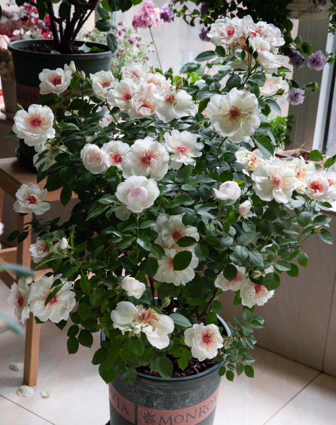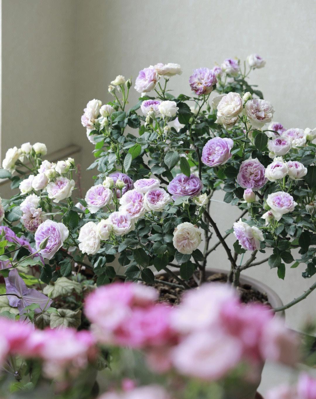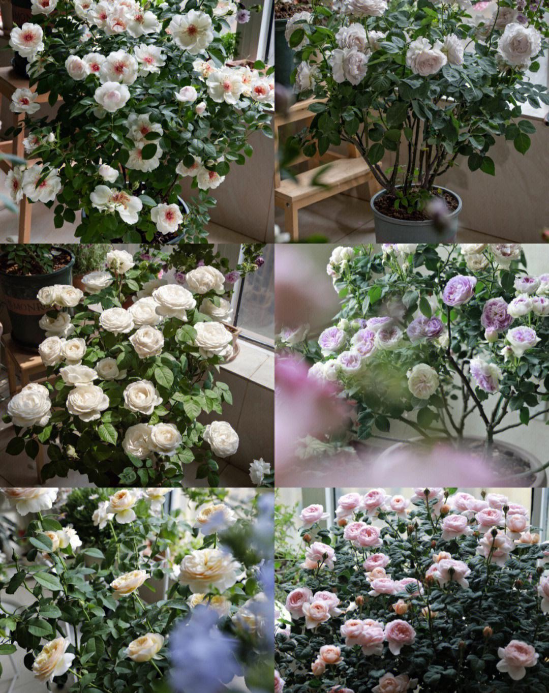 刚买回来的月季小苗,做好这5点,一年能长到五加仑,并在来年开爆盆! 1、买苗:选择靠谱卖家,新手直接选粉丝多的大店,价格会贵些,但基本能保证对版,不会随盆携带很多病虫害,原盆带的土不至于太板结,到手不用洗根换土。收到苗后视情况浇水放在散射光通风处缓苗几天可以带土换盆。 2、配土:小苗建议用颗粒多一点更疏松透气的土壤,以便根系快速生长,根强枝更茂。个人喜欢用粗泥炭土配浮石、蛭石、绿沸石等。土壤里加奥绿缓释肥、松之野、羊粪有机肥作为底肥。这一步嫌麻烦或不会操作的花友可直接去买月季专用园艺土。 3、用盆:拒绝瓷盆,小苗期用陶盆或者加仑盆、青山盆,透气性更好。选择比收货时原盆略大一号的盆器,别偷懒直接上大盆,那月季极有可能干湿循环不好闷根。用配土种植好月季后浇透水,再放到光照充足的地方养护。 4、压枝/修剪:个人不建议小苗过度修剪,收到的小苗如果出现严重偏冠比如一笋冲天其他枝细弱的情况,可以中度修剪笋枝。如果株型整体匀称,不必大剪,可压枝促笋。压枝应选择半木质化后的枝条,韧性更好。压枝方法林林总总,但目的只有一个,就是借用小工具固定直立的枝条使其弯曲,打破枝条顶端优势使营养回流促生底部粗壮枝条。 5、逐步换盆:整个生长期需要根据植株生长的状况逐步换盆,从1/1.5加仑-2加仑—3加仑-5加仑,怎么判断是否需要换盆了?当阳光通风良好情况下,浇水吃不进去很快渗出,或者浇水很快就干了,植物容易出现缺水的症状,那可能根系已经盘满。需适当控水拍松盆壁,可以轻松把植株提出来观察根系的生长状况,长满了就要更换大一号的盆器。 6、施肥:复合肥等新手把握不好容易烧苗,建议选择更加温和的水溶肥营养液等。我常用的是花多多和美乐棵,发芽长枝期用美乐棵通用型(或花多多1号),促进花芽分化。打花苞了用美乐棵花卉型(或花多多2号),高磷钾肥,使花苞膨大,花头更大更饱满鲜艳。 7、修剪:中小苗养护过程中的主要修剪在夏末和冬剪,一般品种在夏末可修剪掉1/3或1/4,冬末修剪掉1/2或1/3,冬剪修剪略重一些。修剪去除病弱枝集中营养,调整株型,促进更多分枝,再换盆埋肥,来年可株型饱满花头林立。