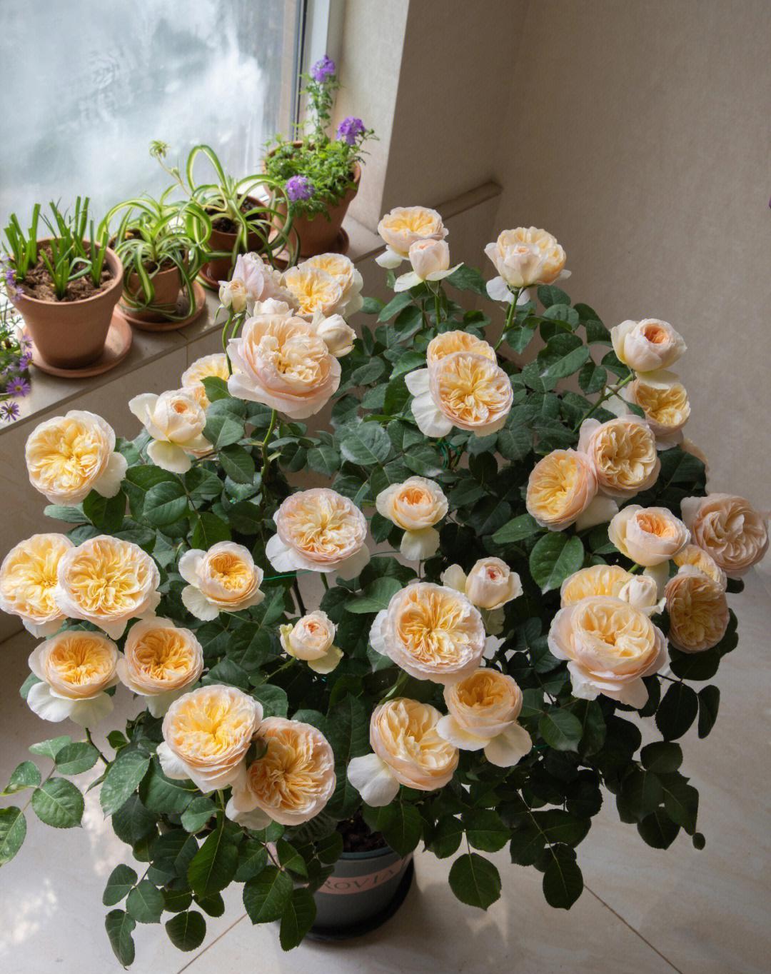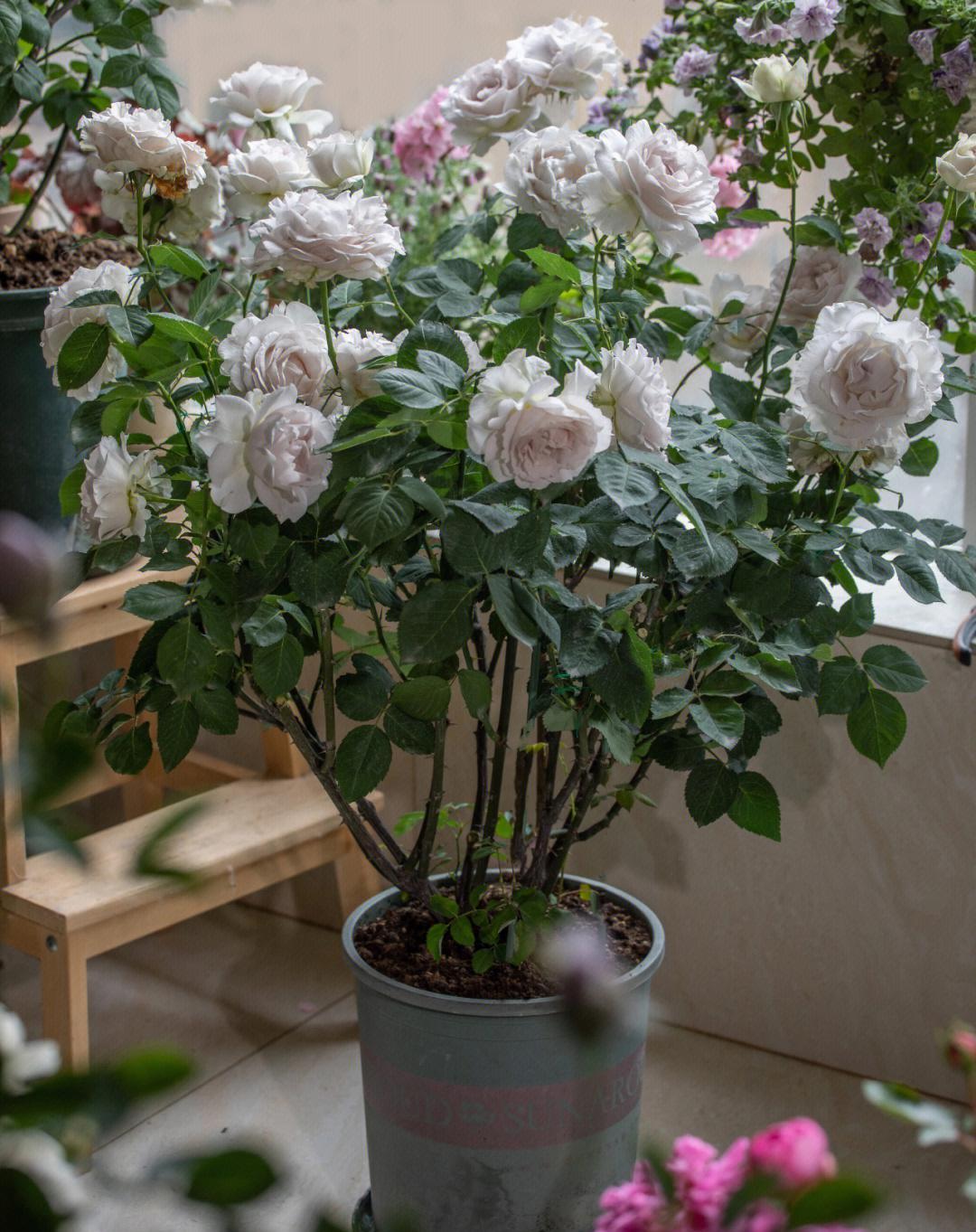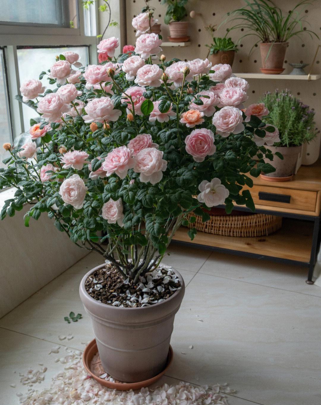 刚买回来的月季小苗,做好这5点,一年能长到五加仑,并在来年开爆盆! 1、买苗:选择靠谱卖家,新手直接选粉丝多的大店,价格会贵些,但基本能保证对版,不会随盆携带很多病虫害,原盆带的土不至于太板结,到手不用洗根换土。收到苗后视情况浇水放在散射光通风处缓苗几天可以带土换盆。 2、配土:小苗建议用颗粒多一点更疏松透气的土壤,以便根系快速生长,根强枝更茂。个人喜欢用粗泥炭土配浮石、蛭石、绿沸石等。土壤里加奥绿缓释肥、松之野、羊粪有机肥作为底肥。这一步嫌麻烦或不会操作的花友可直接去买月季专用园艺土。 3、用盆:拒绝瓷盆,小苗期用陶盆或者加仑盆、青山盆,透气性更好。选择比收货时原盆略大一号的盆器,别偷懒直接上大盆,那月季极有可能干湿循环不好闷根。用配土种植好月季后浇透水,再放到光照充足的地方养护。 4、压枝/修剪:个人不建议小苗过度修剪,收到的小苗如果出现严重偏冠比如一笋冲天其他枝细弱的情况,可以中度修剪笋枝。如果株型整体匀称,不必大剪,可压枝促笋。压枝应选择半木质化后的枝条,韧性更好。压枝方法林林总总,但目的只有一个,就是借用小工具固定直立的枝条使其弯曲,打破枝条顶端优势使营养回流促生底部粗壮枝条。 5、逐步换盆:整个生长期需要根据植株生长的状况逐步换盆,从1/1.5加仑-2加仑—3加仑-5加仑,怎么判断是否需要换盆了?当阳光通风良好情况下,浇水吃不进去很快渗出,或者浇水很快就干了,植物容易出现缺水的症状,那可能根系已经盘满。需适当控水拍松盆壁,可以轻松把植株提出来观察根系的生长状况,长满了就要更换大一号的盆器。 6、施肥:复合肥等新手把握不好容易烧苗,建议选择更加温和的水溶肥营养液等。我常用的是花多多和美乐棵,发芽长枝期用美乐棵通用型(或花多多1号),促进花芽分化。打花苞了用美乐棵花卉型(或花多多2号),高磷钾肥,使花苞膨大,花头更大更饱满鲜艳。 7、修剪:中小苗养护过程中的主要修剪在夏末和冬剪,一般品种在夏末可修剪掉1/3或1/4,冬末修剪掉1/2或1/3,冬剪修剪略重一些。修剪去除病弱枝集中营养,调整株型,促进更多分枝,再换盆埋肥,来年可株型饱满花头林立。