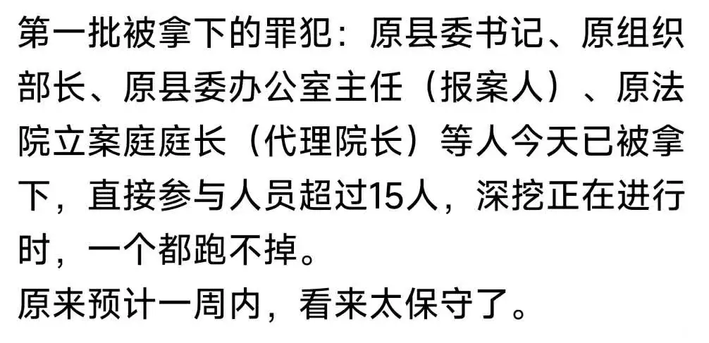 首批罪犯被拿下:原县委书记,组织部长,县委办主任,法庭立案庭长等人已被拿下,直接参与者15人!深挖仍在进行中,一个都跑不掉!