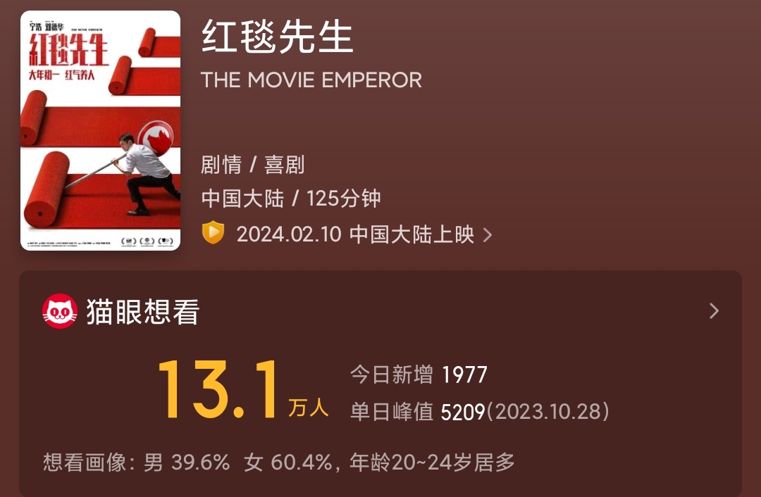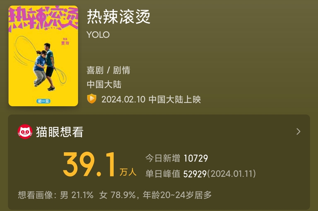 截至目前,2024春节档新片想看榜前5名(猫眼数据) 1,《飞驰人生2》想看人数超过53万 2,《熊出没逆转时空》想看人数超过52万 3,《热辣滚烫》想看人数超过39万 4,《第二十条》想看人数超过30万 5,《红毯先生》想看人数超过13万 你最期待哪一部?