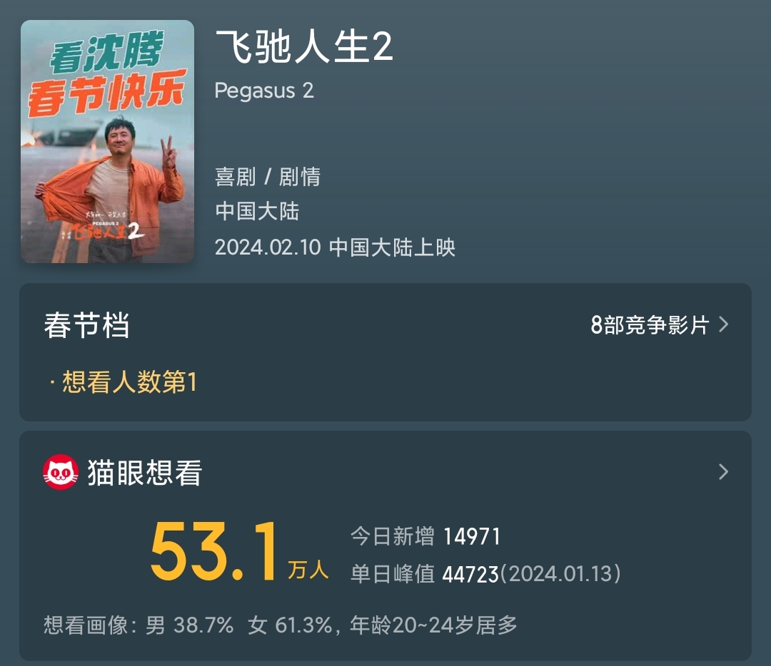 截至目前,2024春节档新片想看榜前5名(猫眼数据) 1,《飞驰人生2》想看人数