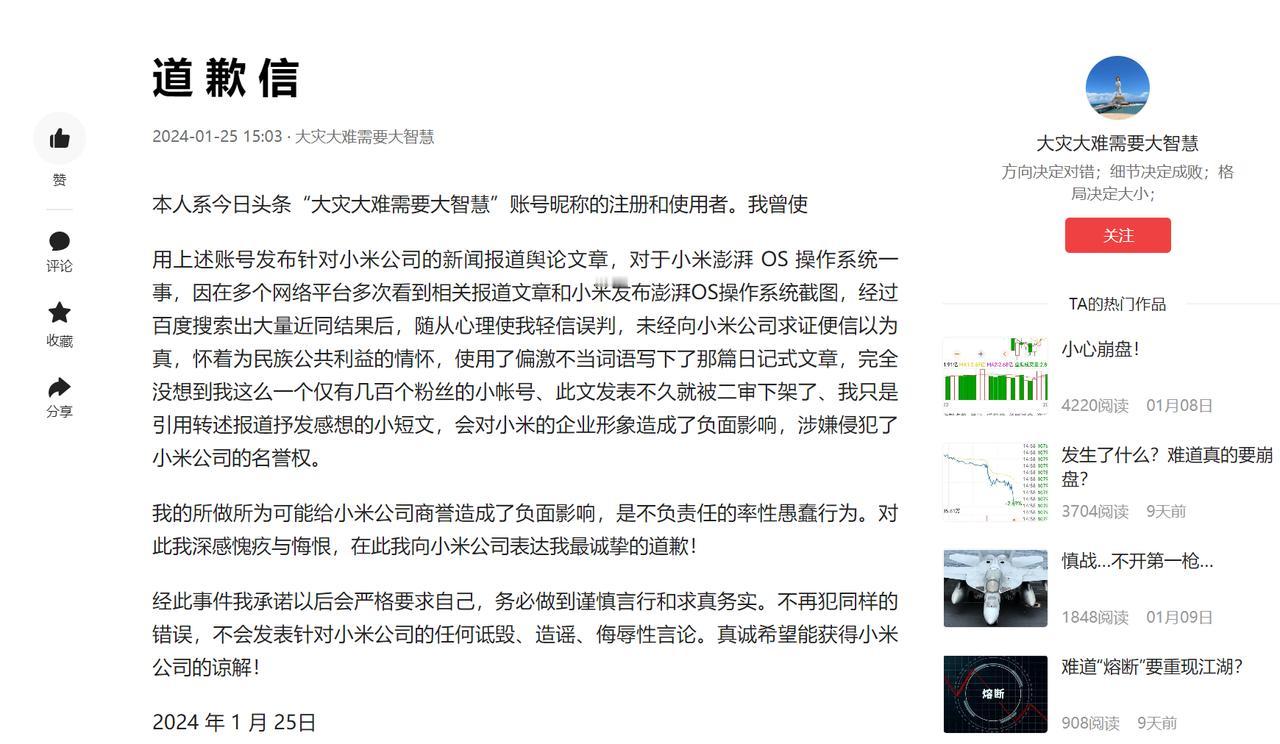 正所谓“早知今日何必当初”,为了一点点流量就歪曲解读,制造舆论,这样真的好吗? 近日,某平台博主发布道歉信,为自己在没有向小米公司求证就信以为真,从而对其造成负面影响的事情进行道歉,并表示自己深感愧疚和悔恨。 咱们客观来说,网络也不是法外之地,在上面发言真的要慎之又慎,坚决不能为了博取流量,武断的下结论,造谣或者抹黑企业。毕竟我国是法治社会,对于这种行为是绝不会让其肆意妄为的,是会让这些无端造谣、抹黑的人收到应有的惩罚。 另外,通过此次事件,也说明小米法务部门正式上线,那些喜欢依靠莫须有抹黑品牌的水军,真的要觉醒了,毕竟害人终害己,说不定哪天就会请去喝茶的,大家说是不是?
