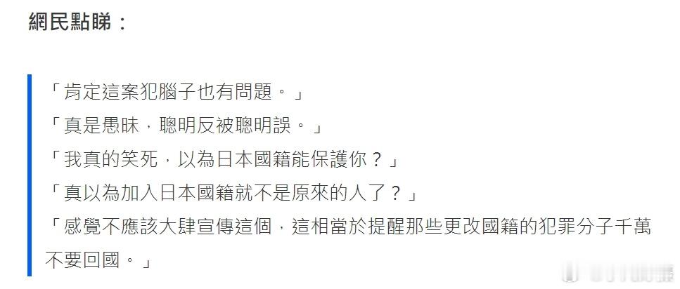有网友表示:感觉不应该大肆宣传这个,这相当于提醒那些更改国籍的犯罪分子千万不要回国。