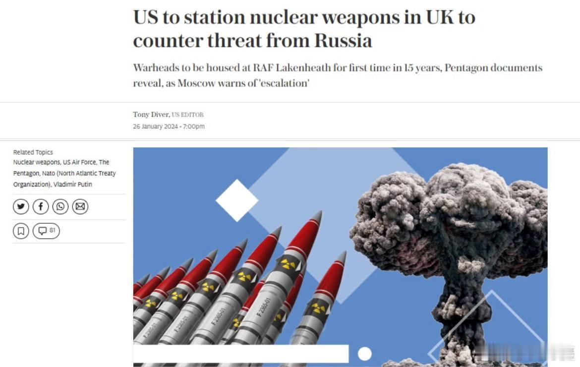 英媒1月26日引述美国防部文件称,美国计划在英国首次15年后再次部署核武器,这是由于俄罗斯的威胁不断增加。