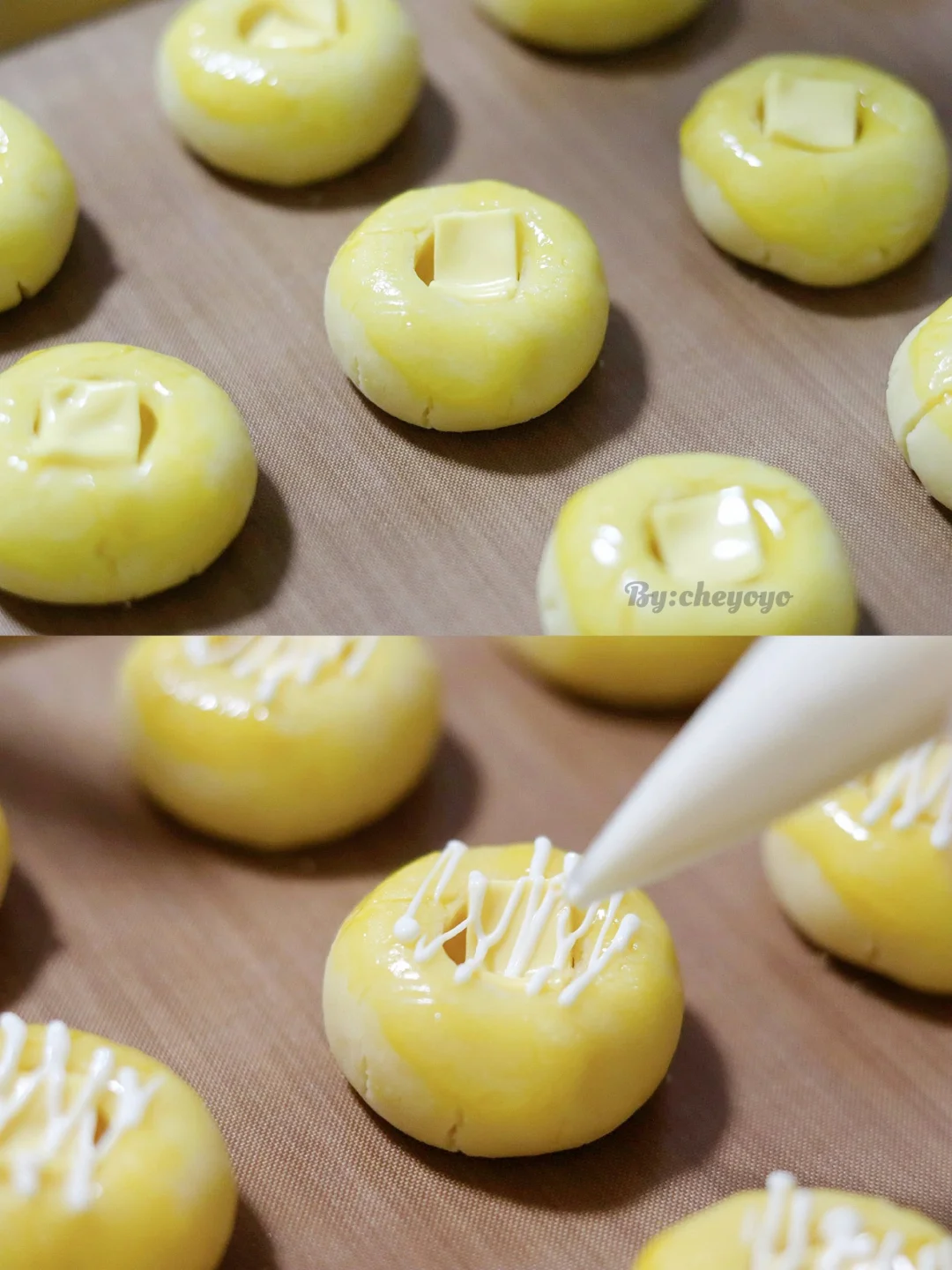 4⃣️ 表面刷上蛋黄液,中间放切成小块的芝士片,记上沙拉酱,再撒少许欧芹碎;