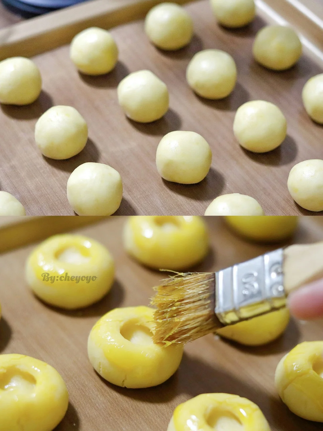 3⃣️ 将面团分成25g一份,滚圆后均匀摆到烤盘上,用大拇指压扁;