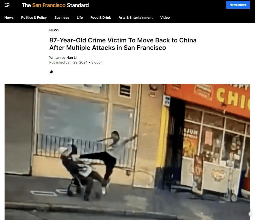 据美媒:一名年长的中国移民男子在旧金山经历了多起野蛮袭击后,决定搬回中国,其中一起备受关注的事件被摄像机拍了下来。