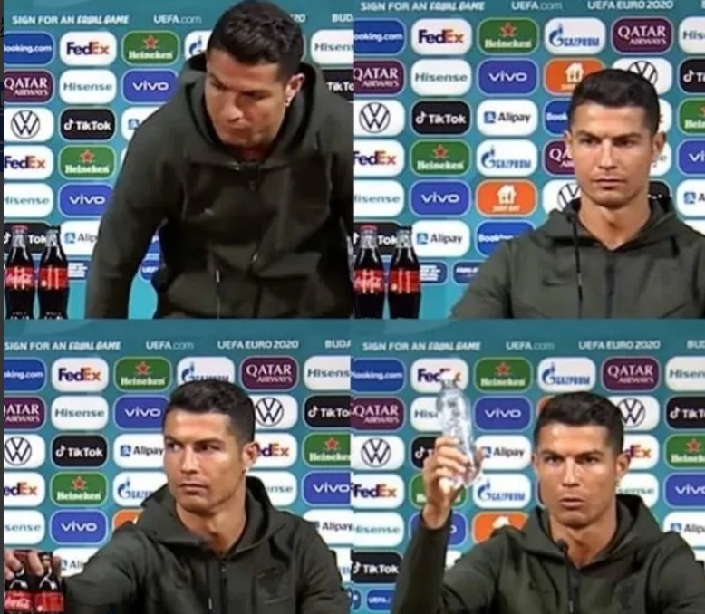 C罗好像有百事的代言吧,放了可口的估计是要被罚钱
