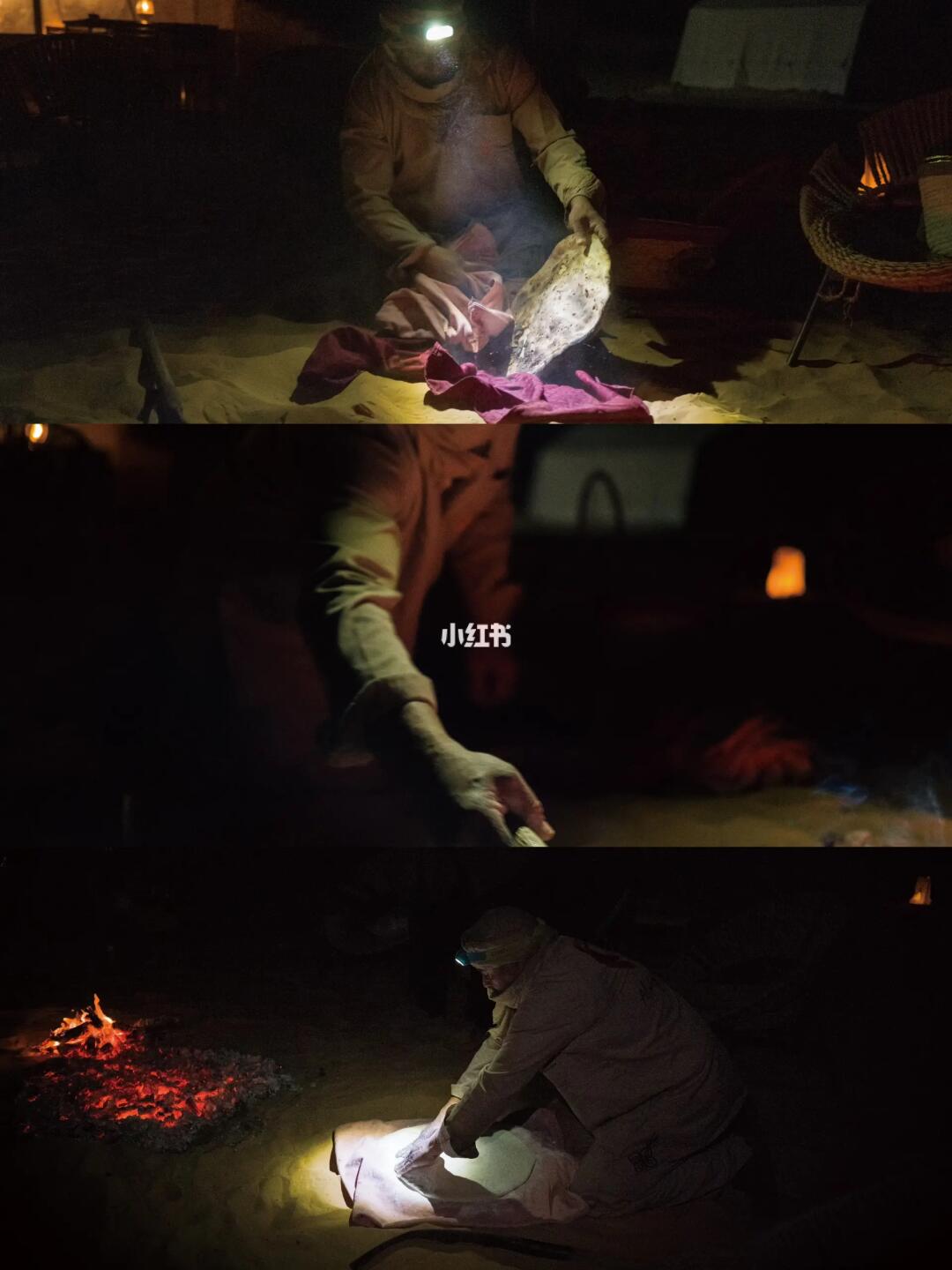 晚餐是在类似一个食堂公共区的大帐篷里用餐,这次还遇到了营地的老板,拿出了好酒招待我们。晚餐后就是篝火晚会,当地的柏柏尔人还会制作一种特殊的烤饼🫓,在篝火的地方挖一个坑,将揉好的面饼放在里面,然后盖上沙子,再把柴火放在上面继续燃烧🔥,大概二十分钟就做好了,味道特别香,记忆难忘!!!