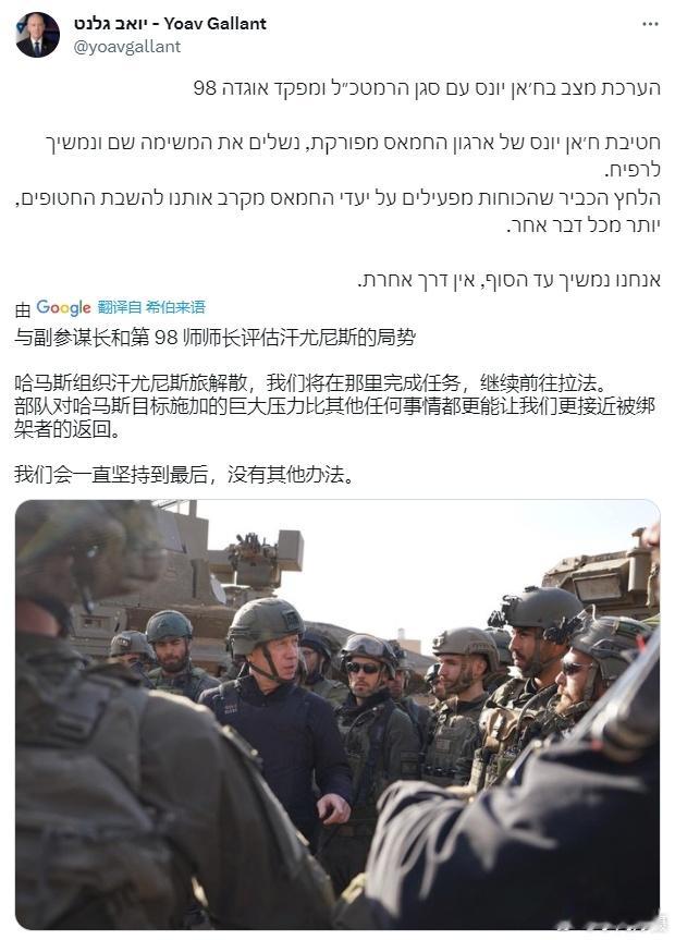 以色列防长加兰特称:以军在加沙南部汗尤尼斯市的军事行动接近完成,将进一步推进加沙南端与埃及接壤的拉法市,以此彻底歼灭哈马斯。