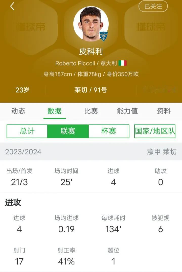 🇮🇹意大利足球🇮🇹 皮科利本赛季最少三次挽救莱切队输球了 主力外援比他多踢15场首发主力,就比他多进一个球。