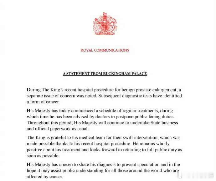 据英国广播公司消息,查尔斯三世确诊的癌症并非前列腺癌,而是在他最近治疗前列腺肥大时发现的。截至目前,白金汉宫未透露癌症的类型,但根据白金汉宫发布的声明,国王查尔斯三世已于5日开始接受治疗。