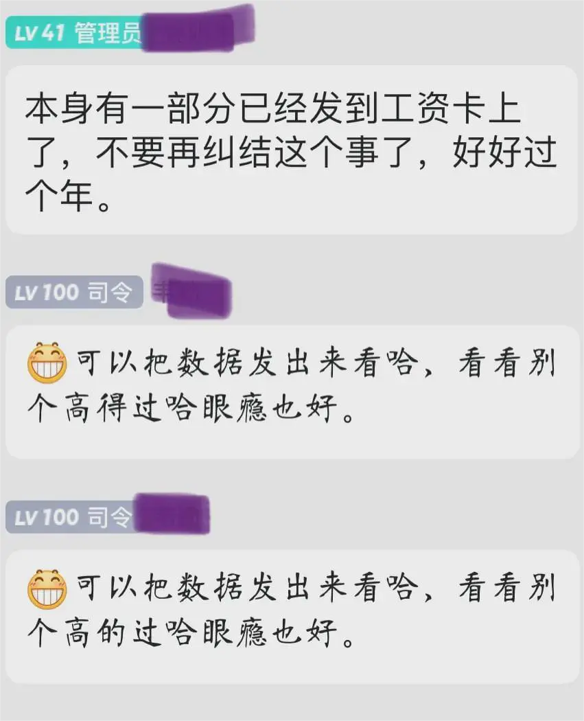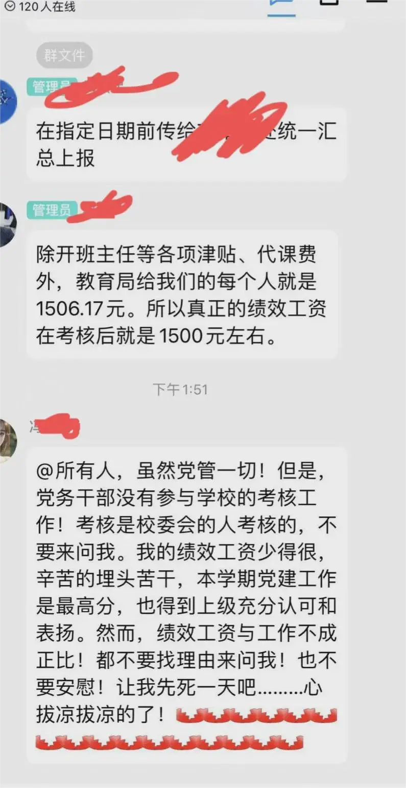 学校也不再是净土了。刚刚遵义某小学发放了2023年9月---2024年2月的绩效工资。本来是一件高兴愉快的事情,过年嘛,发点钱在手里何乐而不为呢是吧!人都是患寡而患不均,老师之间绩效差距大了,就有人会闹腾起来。这不就发生了下面这样的事儿。有老师就在群里质问,为什么不公开绩效考核,有部门负责人回答:各位同仁,大家新年好。还是那句话,工资也好、课后服务费也好、绩效工资也好。大家切莫攀比,每一个数据后面都有很多数据在支撑。没有谁会为谁多算或少算。有校领导发言:本身有一部分已经发到工资卡上了,不要再纠结这个事了,好好过个年。最后得出来了基础绩效是1506.17元,学校还是不发公示,大家还是不晓得别人绩效多少。反而是这样大伙私底下议论的更多。我就想不明白,为啥就不能公示呢?难道有什么猫腻吗?最后发言的这个老师喜提十天禁言。