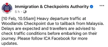 由于长提的车龙太长,已经塞到了兀兰关卡,新加坡移民与关卡局也在早上发文,称通关时间将会延长。