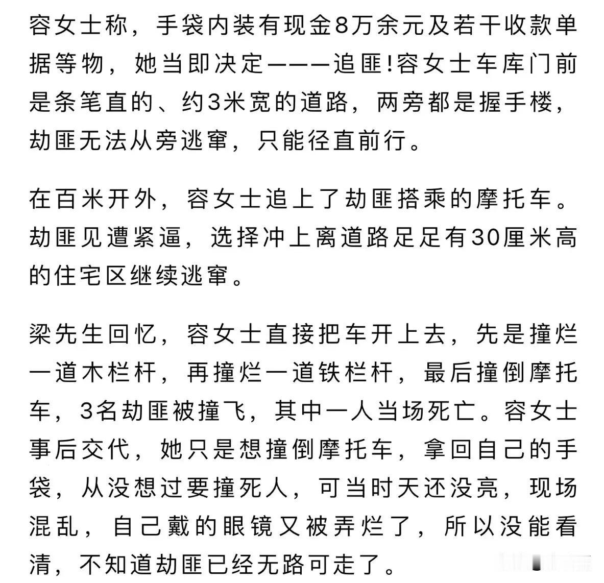 广东顺德,女司机8万现金被抢,为追回猛踩油门,不慎将一名劫匪撞死!而有法律人士认为,女司机的行为属于防卫过当,因为劫匪已经得手并离去,女子进行反击,已经超过了正当防卫的有效时间,构成另一新的犯罪,但法院的判决大快人心! (来源:1018 陕广新闻) 容女士37 岁,是一个女强人,自己经营着生意,收入很是不错,而这离不开她的勤奋努力! 去年7月13日凌晨5时许,容女士开车出门去做生意。但万万没想到,车子刚开出车库,就有2名年轻人提前埋伏在她家车库旁,手持铁制钻头猛砸她的车窗! 容女士当时吓坏了,拼命按喇叭呼救,但当时天还没亮,路上行人很少,所以没人前来相助! 而2 名年轻的劫匪将车窗敲碎后,拉扯容女士的头发,夺走容女士放在副驾驶位的手袋。然后搭乘同伴的摩托车逃窜! “啊,我的钱啊……” 容女士看到自己的8万元被抢,心里不甘心,猛踩油门追击。 在百米开外,容女士追上了劫匪的摩托车。劫匪看前方无路可走,慌乱之下选择冲上离道路足足有30厘米高的住宅区。 而容女士没有多想,直接撞烂一道铁栏杆,然后又撞倒摩托车。3名劫匪被撞飞,其中一人当场死亡。 看到这一幕,容女士大脑空白了,而2名活着的劫匪,也吓呆在现场。 事后,容女士向警方交代,她只是想把自己的钱追回,从没想过要撞死人,可当时天还没亮,她戴的眼镜又被弄烂了,所以没能看清…… 而大部分网友认为,容女士的行为是正当防卫,劫匪被撞死,那也是他自己活该! 但是,法学界有人士认为,劫匪抢钱后已经逃跑,对容女士的抢劫侵害行为已经结束。可容女士不依不挠,主动撞击犯罪嫌疑人,属于防卫过当,要负刑事责任并且承担民事赔偿! 因为罪劫匪已经得手并离去,其对容的人身危害形成的威胁也已消失,所以容女士的行为,已经超过了正当防卫的有效时间。 但主审法官却有不一样的看法!他认真分析整个过程后,认为歹徒虽然开摩托车逃离,但并没有离开容女士的视野范围内! 换而言之,歹徒的抢劫行为可认定为仍然在进行的过程当中! 所以法院认为,容女士虽然造成一名歹徒死亡的结果,但依然“正当防卫”的规定。 法律依据:正当防卫是对正在进行行凶、杀人、抢劫、强奸、绑架以及其他严重危及人身安全的暴力犯罪,采取防卫行为。而在过程当中,造成不法侵害人伤亡的,不属于防卫过当,不负刑事责任。 至于活着的两名歹徒,构成抢劫罪无疑,因此分别判决两劫匪有期徒刑12年、11年,剥夺政治权利3年,并处罚金12000元、11000元。 两名劫匪不服,提起上诉,但二审依然维持原判! 此事引发了热议,有网友说,那些法律人士说抢到东西后“抢劫侵害行为已经结束”,就是说劫匪可以摆摆手跟受害人说“嘿,结束,结束了,你不能动我哦,否则你就是犯法了”是吗?居然还有这样的认知?! 也有网友说, 判得好!如此判,才能震摄犯罪分子,提高公民与犯罪分子做斗争的勇气! 还有网友说,过于考虑人渣罪犯的权益就是对善良正义的伤害,从劫匪抢劫那一刻开始,所造成的一切关联结果都应该由劫匪承担。 我认为,起因是不法行为,法不能向不法让步!代价要让罪犯承担,只有这样,任何人都不敢越过法律,自觉守法。 如果按部分“法律人士”的观点,被抢劫后是不能追劫匪的,毕竟犯罪已经结束了,就算是追上了也要和歹徒好好说话,而且不能用一点强制手段制止他逃跑,要不然就侵害对方正当权益了,这就是离谱! 只有让罪犯承受高额代价,才能阻止更多的犯罪!!!