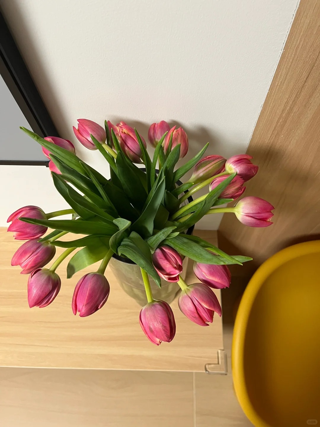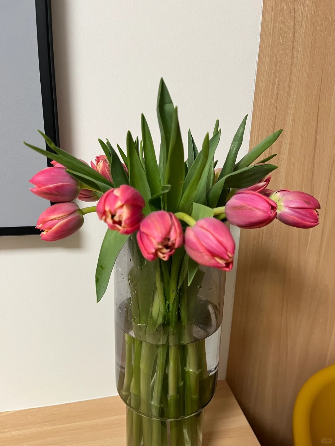 第一次买郁金香🌷,这个状态咋回事 摸起来还是挺有生机活力的,但是它的头都是垂垂哒哒的,直接塞了最深的瓶子,让它的头尽量立起来。