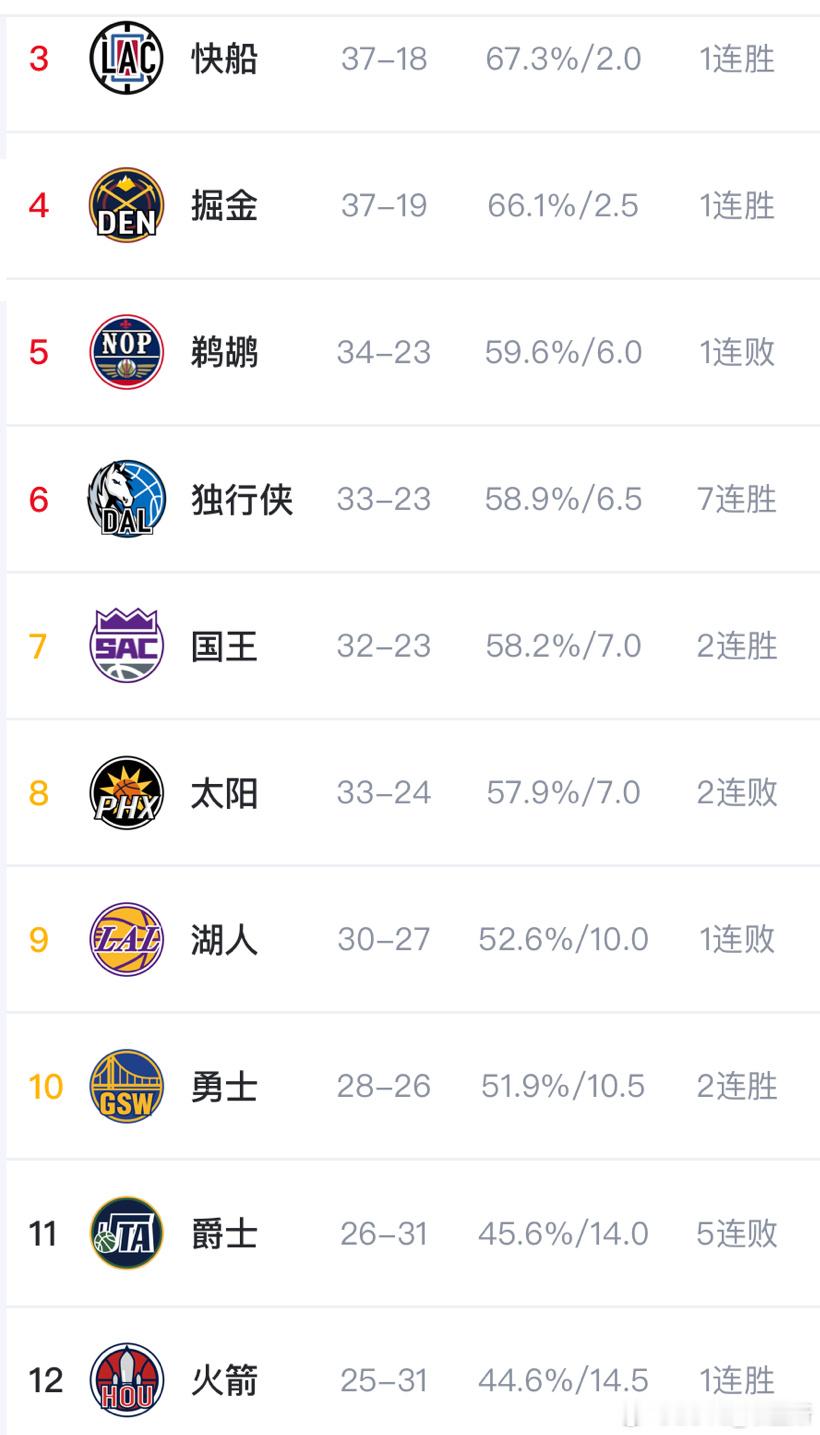👀最新西部排名,没有比赛的湖人升到西部第三。