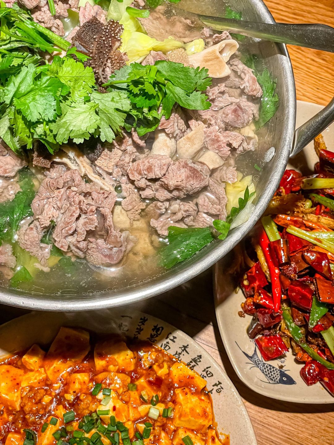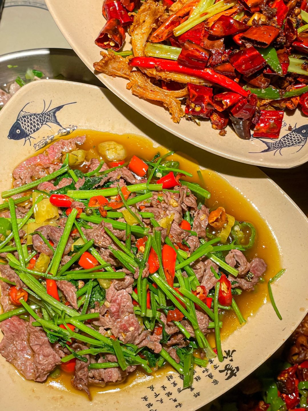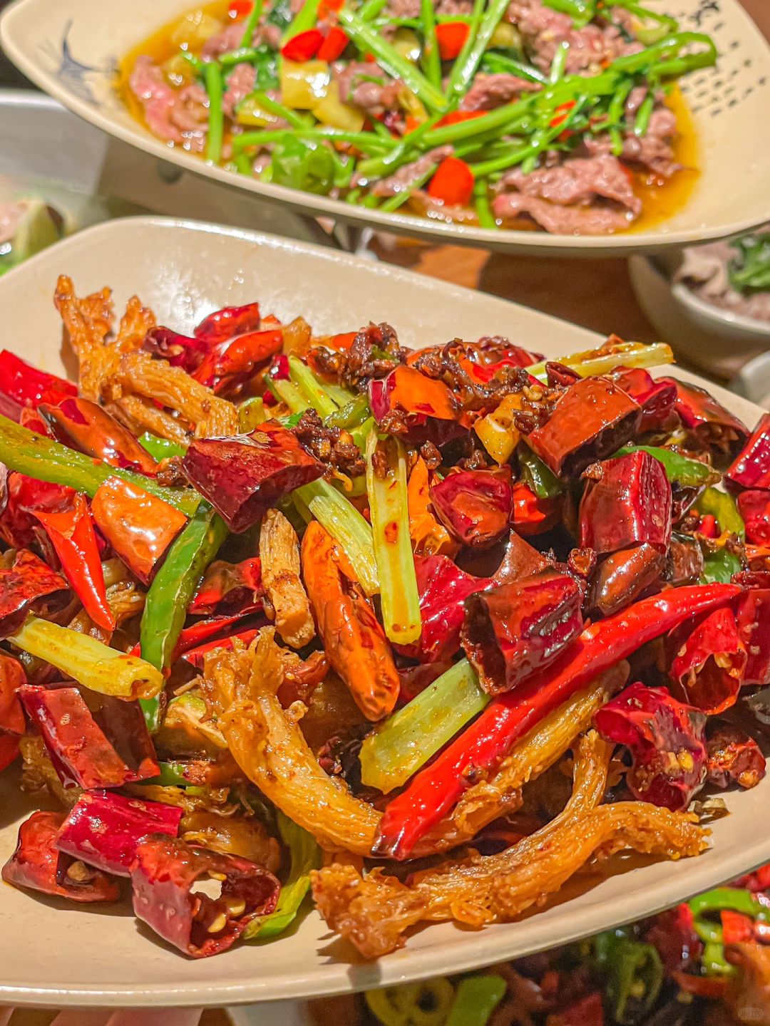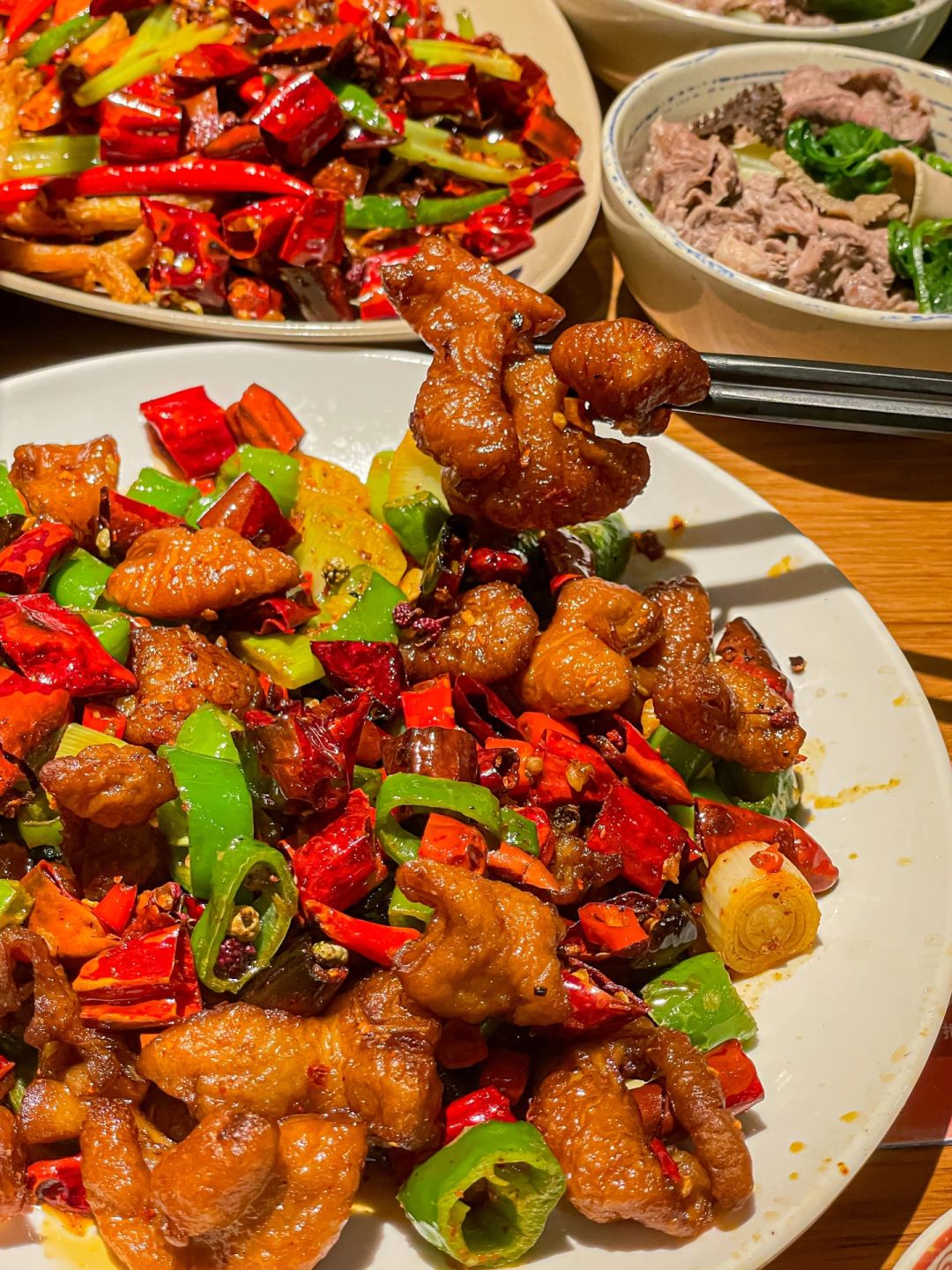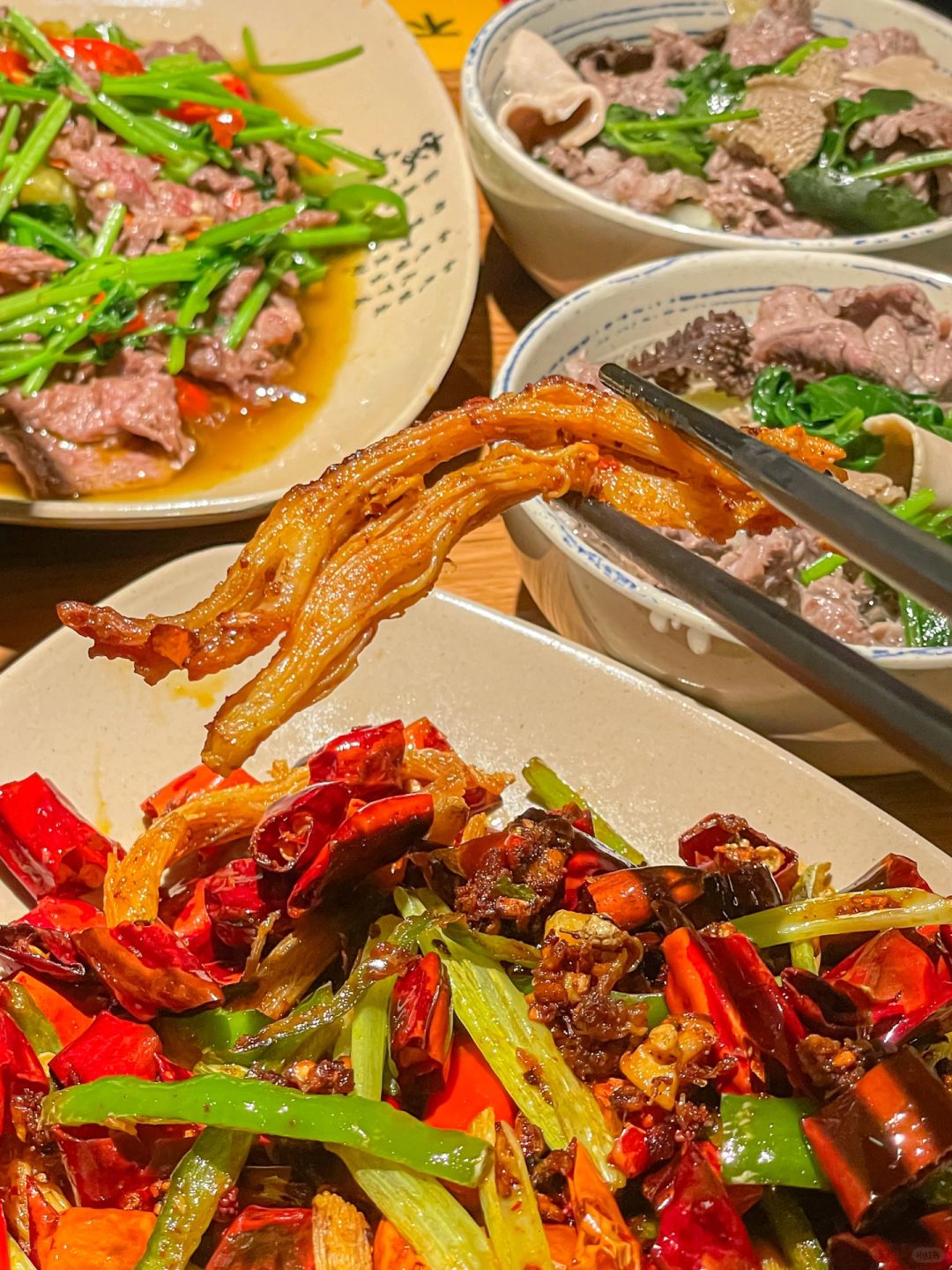 四川朋友推荐来的跷脚牛肉🥢 个人感觉他家炒菜也很好吃啊 🌶️点了干煸猪鼻筋,生爆肥肠,火爆鲜吊龙,脑花烧豆腐 量也蛮大的🍚kuku炫了两碗米饭!