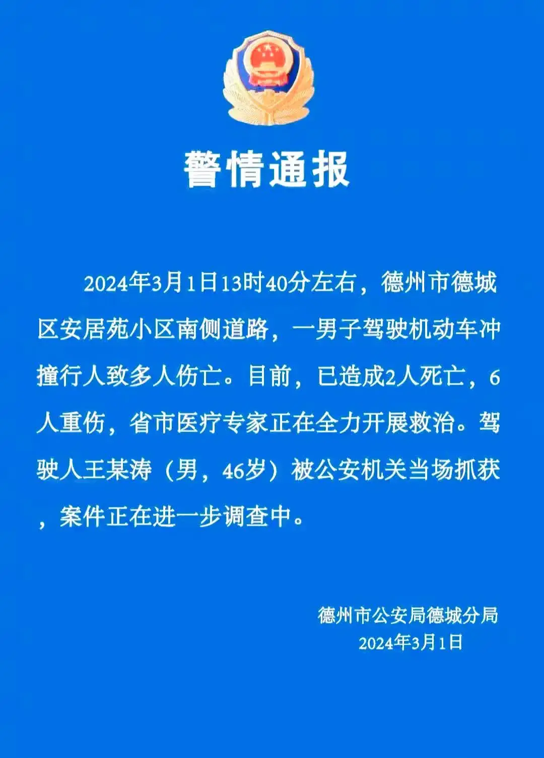 刚刚德州公安通报称:目前,已造成2人死亡,6人重伤,正在全力开展救治。驾驶人王某涛(男,46岁)被当场抓获。