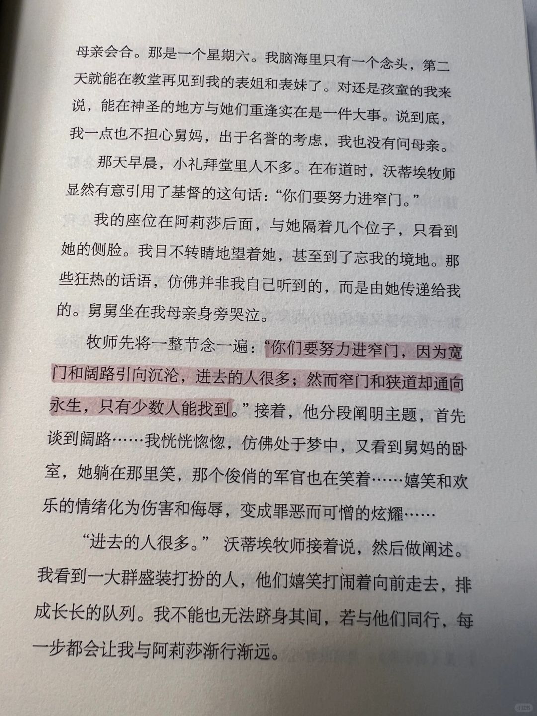 🚪表姐阿丽莎是一个饱受自己精神折磨的人,母亲的浪荡对已进入青春期的阿丽莎带来的打击是毁灭性的,从对杰罗姆毫无掩盖的情感,到拒绝他的求婚,得知妹妹也喜欢杰罗姆预成人之美,到两地传书愉悦到见面尴尬的扭曲,她一直在蹉跎中磨练自己,最终达到了禁欲状态