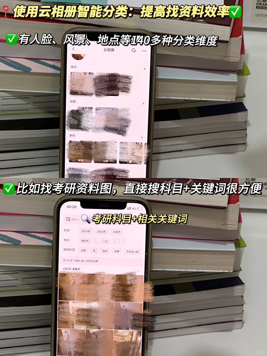 ③云相册智能分类:有人脸、风景、地点等140多种分类维度,可交又搜索,找考研资料图,直接搜科目+考研关键词很方便