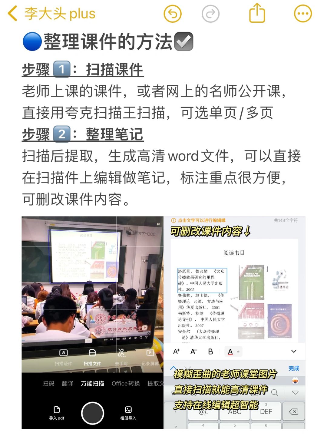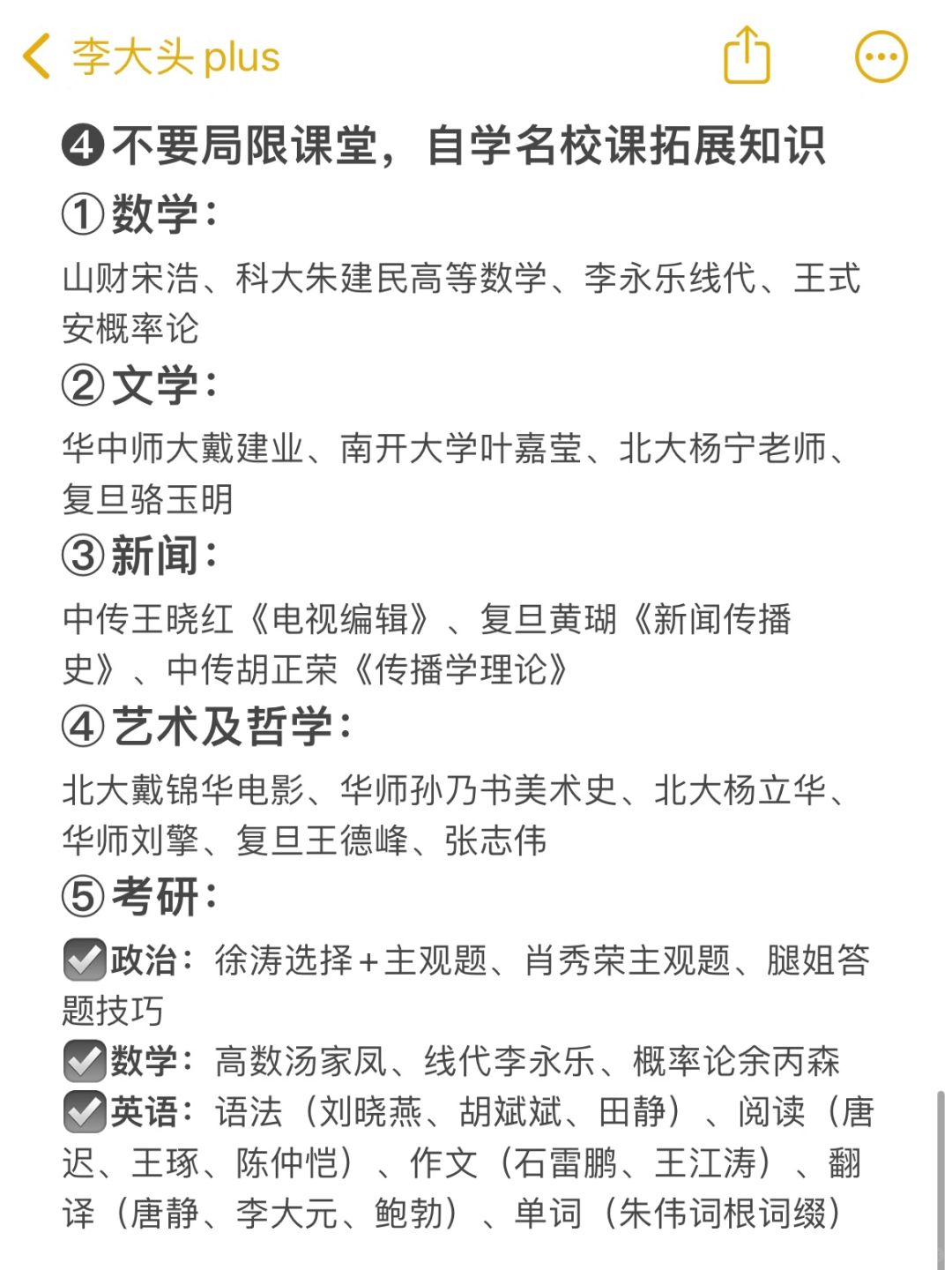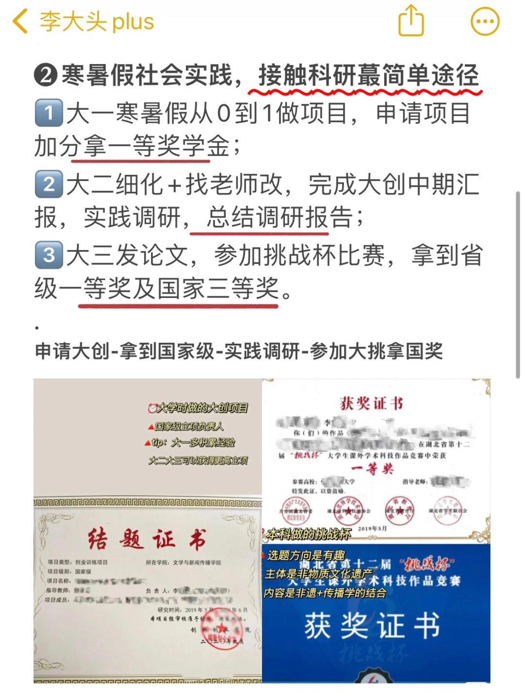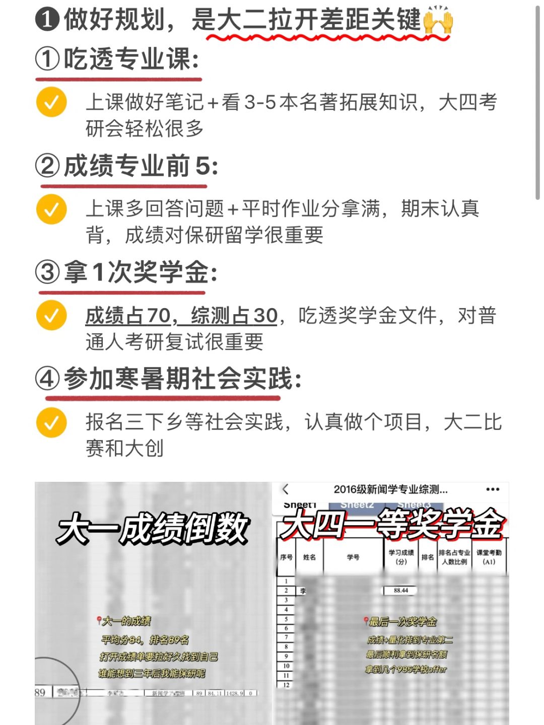 我是大头学长,二本上岸北外研究生。 大一我在社团采访时,遇到一个学霸师兄:他是个二本男生,大一成绩一般、大四却强势保研985。他告诉我,做了3件事逆袭: . ①申请寒暑假社会实践,云南调研一个月,项目4年拿3个大奖 ②加入老师课题组:积累科研成果,研究生复试逆袭 ③坚持学英语,大一四六级600+,缩小与名校生差距 . ❶做好规划,是大二拉开差距关键 ①吃透专业课: 上课做好笔记+看5本名著拓展知识,大四考研会轻松很多 ②成绩专业前5: 上课多回答问题+平时作业分拿满,期末认真背;吃透奖学金文件,对保研留学考研很重要 ③参加寒暑期社会实践: 报名三下乡社会实践,认真做项目,大二比赛和大创 · ❷接触项目,积累科研经验 进老师创新团队,有很多项目;大一跟学姐参赛,积累经验;大二核心带队参赛,拿奖+学校资源 ①论文工具:万方、知云、镝数据 ②办公工具:拉小登、旁门左道、王佩丰 ③作图工具:敬伟、影视飓风、林海音 . ❸坚持学英语,高分考过四六级 ①听力:田朝霞语音课+周育如音标 ②口语:夏冰雹频道+杨帅口语+一支糯可恩 ③语法:张满胜语法思维+英语平行世界 ④阅读:唐迟阅读+田静每日一句+刘晓燕长难句 . 方法: ①学经验要科学做笔记:网上图片干货,不用敲字整理,导入夸克扫描王提取文本转word,删改、标注重点生成专属笔记。笔记会智能命名加标签,存到自定义文件夹随时学习,智能文件处理效率高 ②翻译TED文章:先逐字逐句翻译,再用夸克扫描王拍下全文秒出翻译,不用挨个查意思,对照订正。还能单独取词翻译,专业名词翻得很准 ③练翻译阅读题:用笔圈出关键词,避免重复看题。做过的试题用夸克扫描王去手写功能去除笔迹,二刷巩固知识,也可用夸克APP里夸克扫描王 · ❹不要局限课堂,自学名校课 ①数学:山财宋浩、李永乐线代、王式安概率论 ②文学:华师戴建业、南开叶嘉莹、北大杨宁 ③新闻:北大王晓红、复旦黄瑚、中传胡正荣 ④考研:唐迟阅读、石雷鹏作文、朱伟单词、汤家凤数学